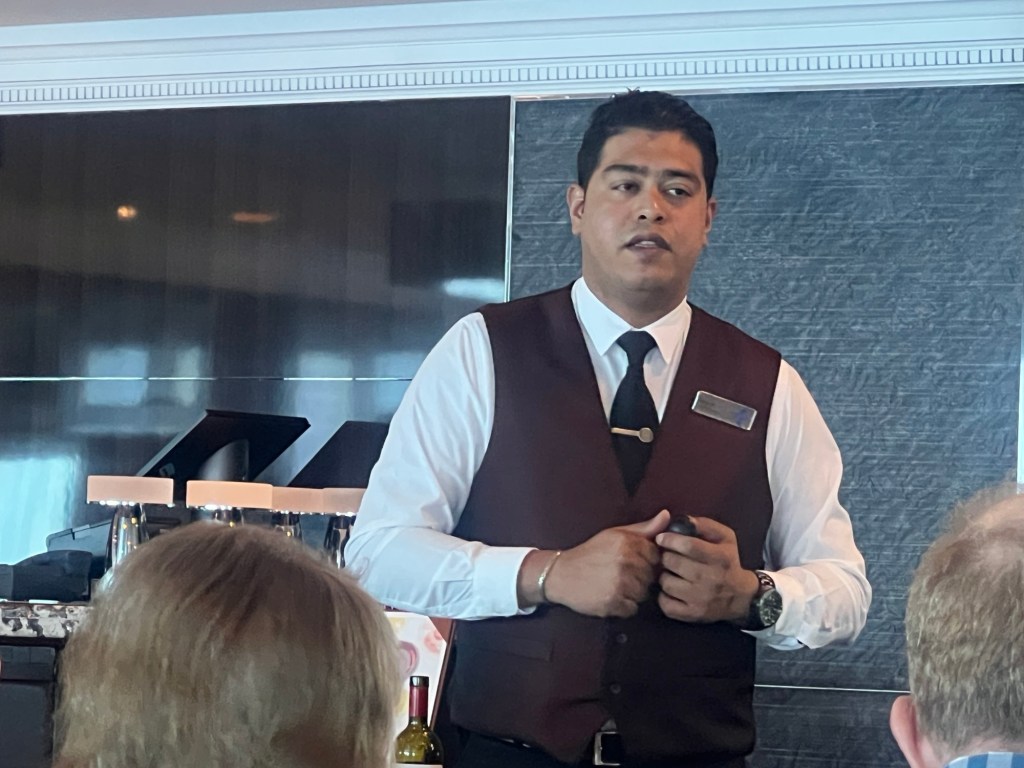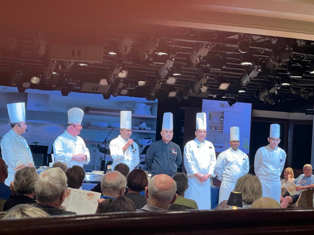 Of course there was a cooking demonstration where the executive chef, Colin, made beef stroganoff and beef tartar. Before the demo, Colin introduced the head team of chefs. There are 76 chefs on the ship. They have enough eggs to serve each guest 12 – 15 during the voyage. With about 660 guests on board, that’s a lot of eggs. They also go through 100 pounds of sugar a day.
