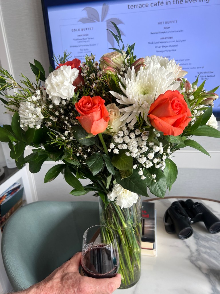 When we returned to the ship, we got these flowers with no card- we assume it is a gift from the ship. Very beautiful bouquet. I had a 1:30 zoom meeting so we had lunch and went to make our next spa appointments!