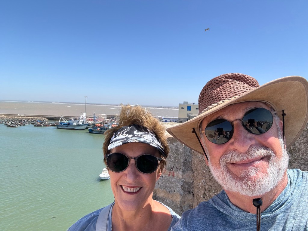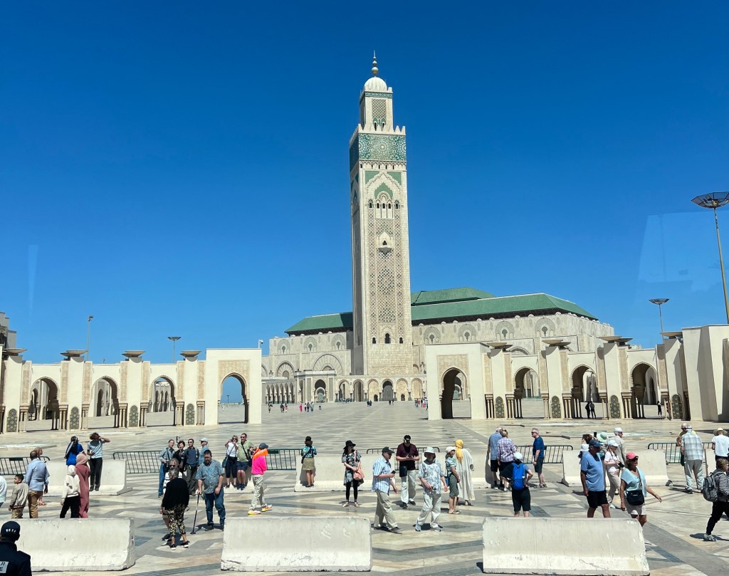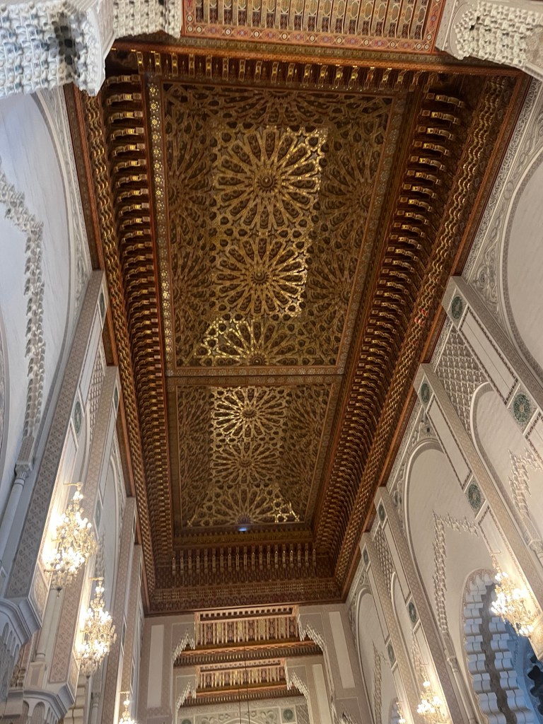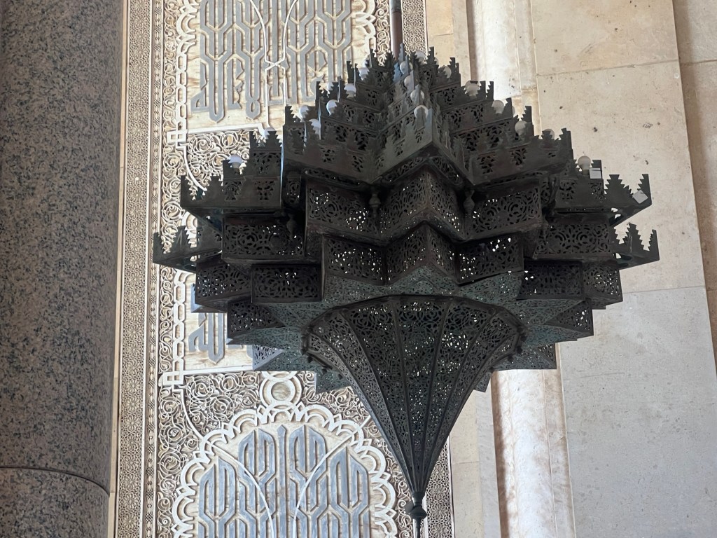 We drove through the city to the Hassan II Mosque which is quite amazing. Non Muslims can apparently not enter unless on a tour. The compound is huge and has a school and many other buildings. It is one of the largest mosques in the world. It’s known for its stunning architecture, including the 210-meter tall minaret, making it the tallest religious structure in the world. The mosque can accommodate up to 105,000 worshippers and features intricate marble flooring, exquisite tilework, and a retractable roof. It’s also situated partially over the Atlantic Ocean, providing a breathtaking view. Completed in 1993, the mosque is a masterpiece of Moroccan craftsmanship and Islamic architecture. Larrbe told us it took 15 million hours to build and was completed in 5 years. Cedar, marble, bronze and Murano glass were used in the building. Moroccan people from the city all contributed to the building of the mosque. Rich people contributed a lot but even those with little money used boxes that were placed all around the city to contribute even a small amount.