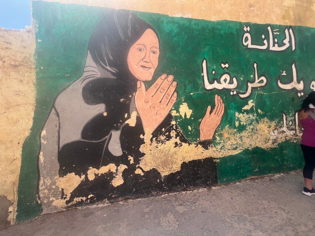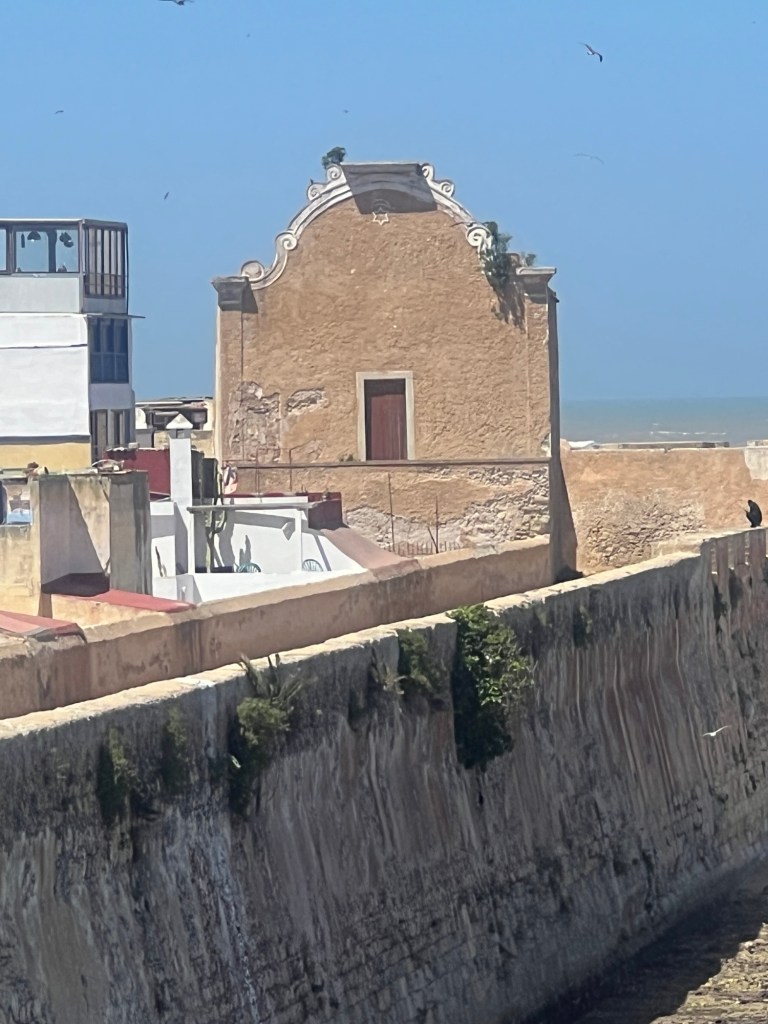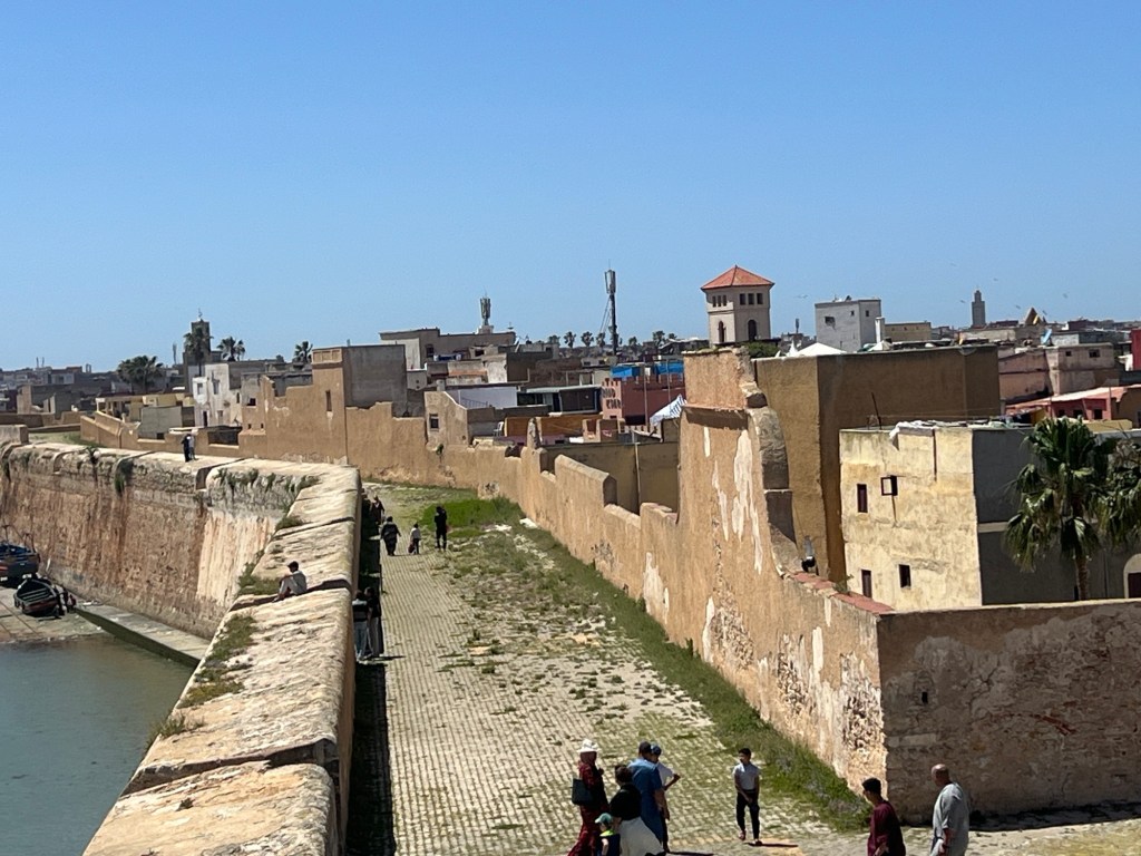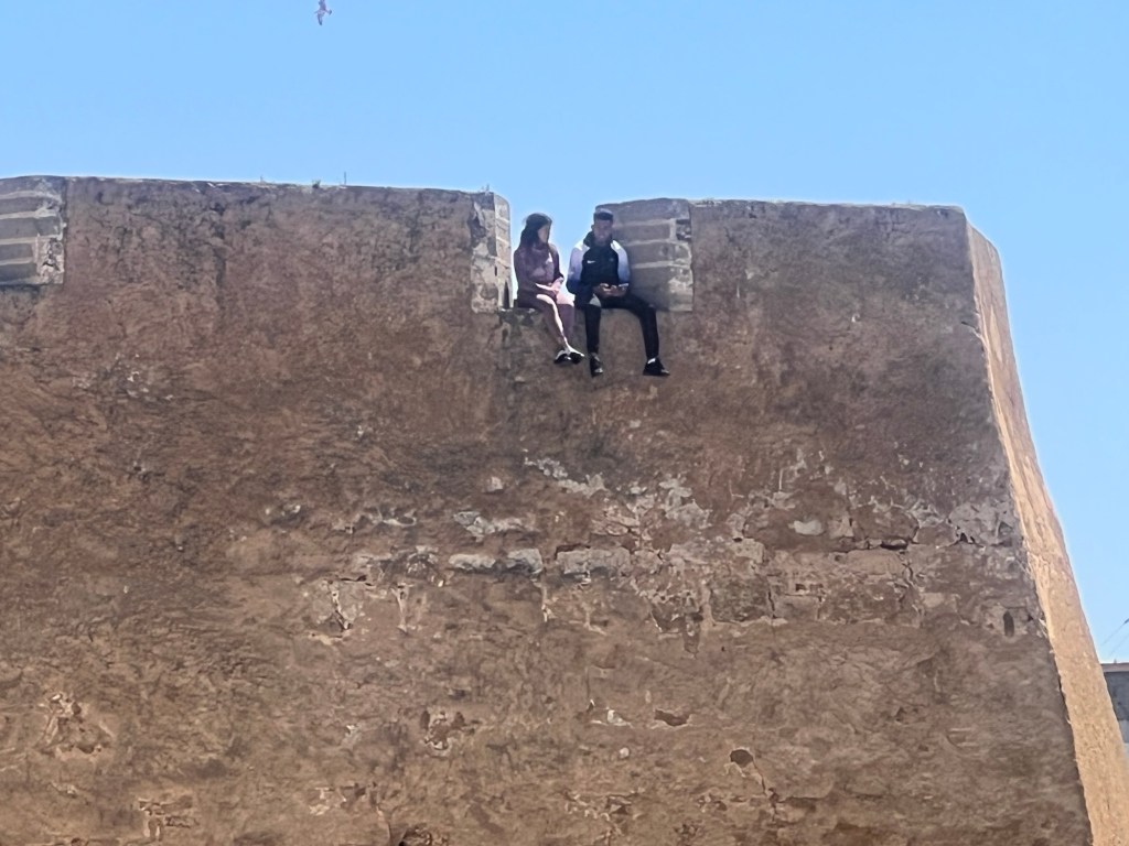 We drove through the city to the Hassan II Mosque which is quite amazing. Non Muslims can apparently not enter unless on a tour. The compound is huge and has a school and many other buildings. It is one of the largest mosques in the world. It’s known for its stunning architecture, including the 210-meter tall minaret, making it the tallest religious structure in the world. The mosque can accommodate up to 105,000 worshippers and features intricate marble flooring, exquisite tilework, and a retractable roof. It’s also situated partially over the Atlantic Ocean, providing a breathtaking view. Completed in 1993, the mosque is a masterpiece of Moroccan craftsmanship and Islamic architecture. Larrbe told us it took 15 million hours to build and was completed in 5 years. Cedar, marble, bronze and Murano glass were used in the building. Moroccan people from the city all contributed to the building of the mosque. Rich people contributed a lot but even those with little money used boxes that were placed all around the city to contribute even a small amount.