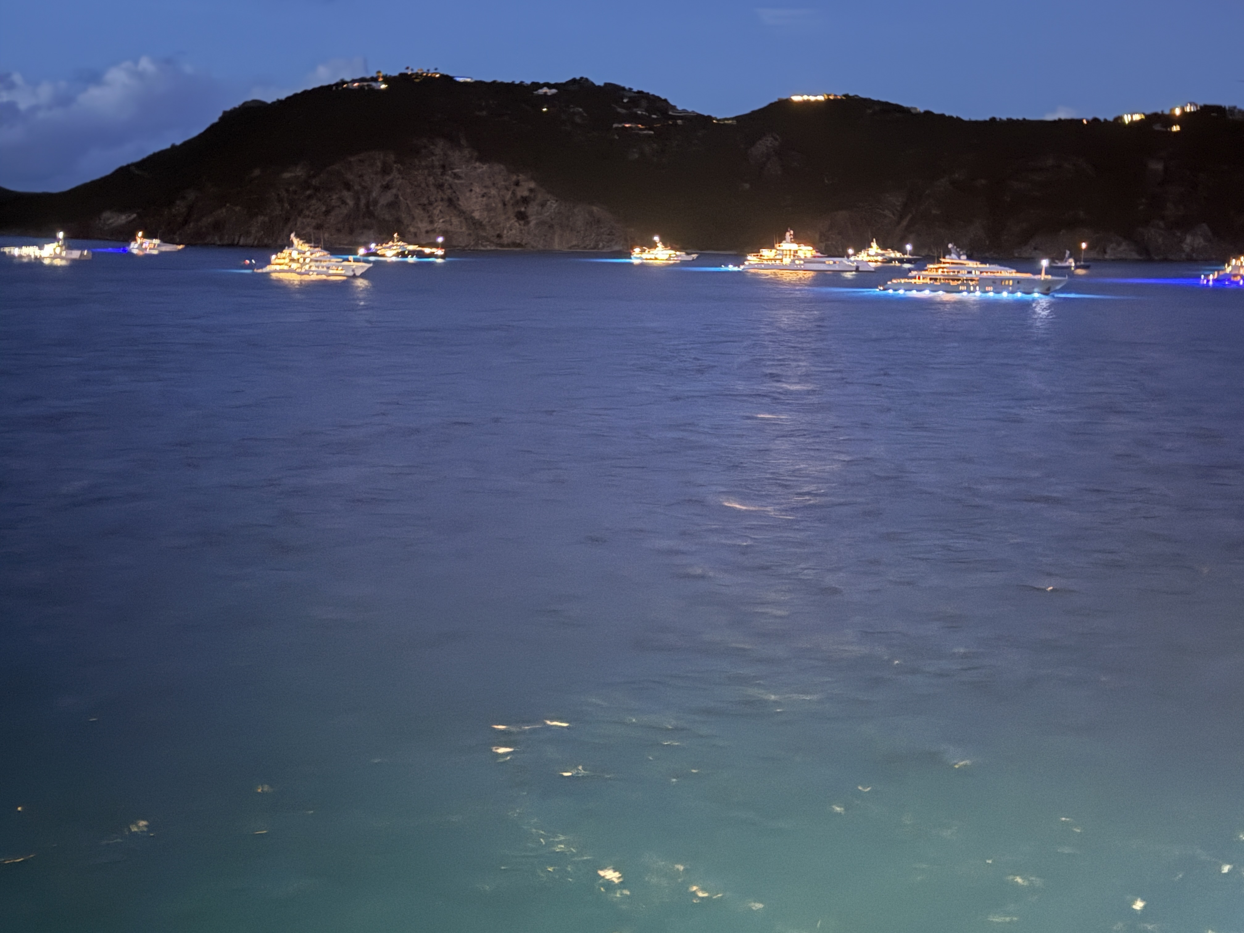 Last night, it was dark when we left St. Barts and it was fun to see all the yachts in the harbor beautifully lit up. Of course, the Bezos yacht was there. Is it following us?
