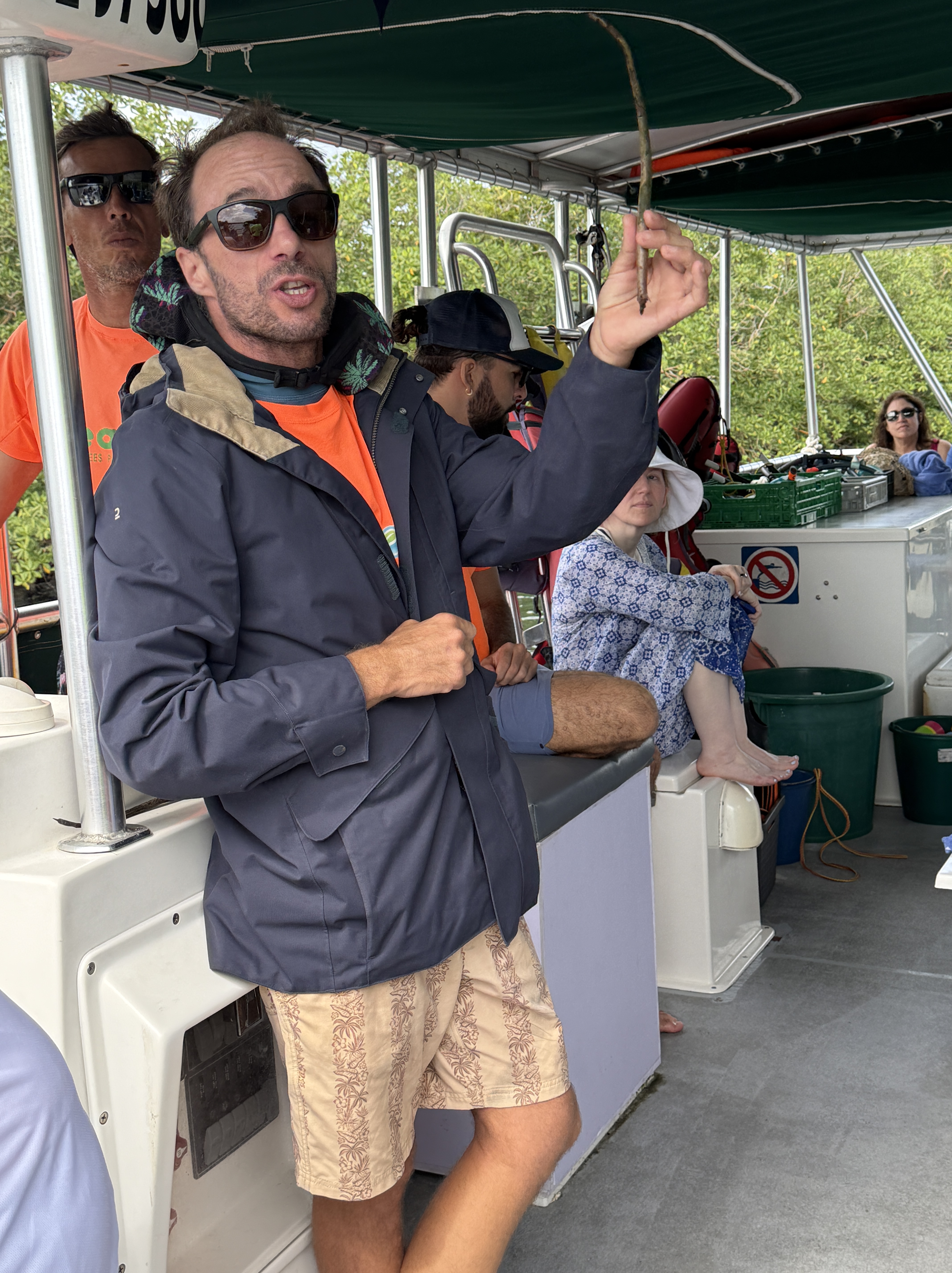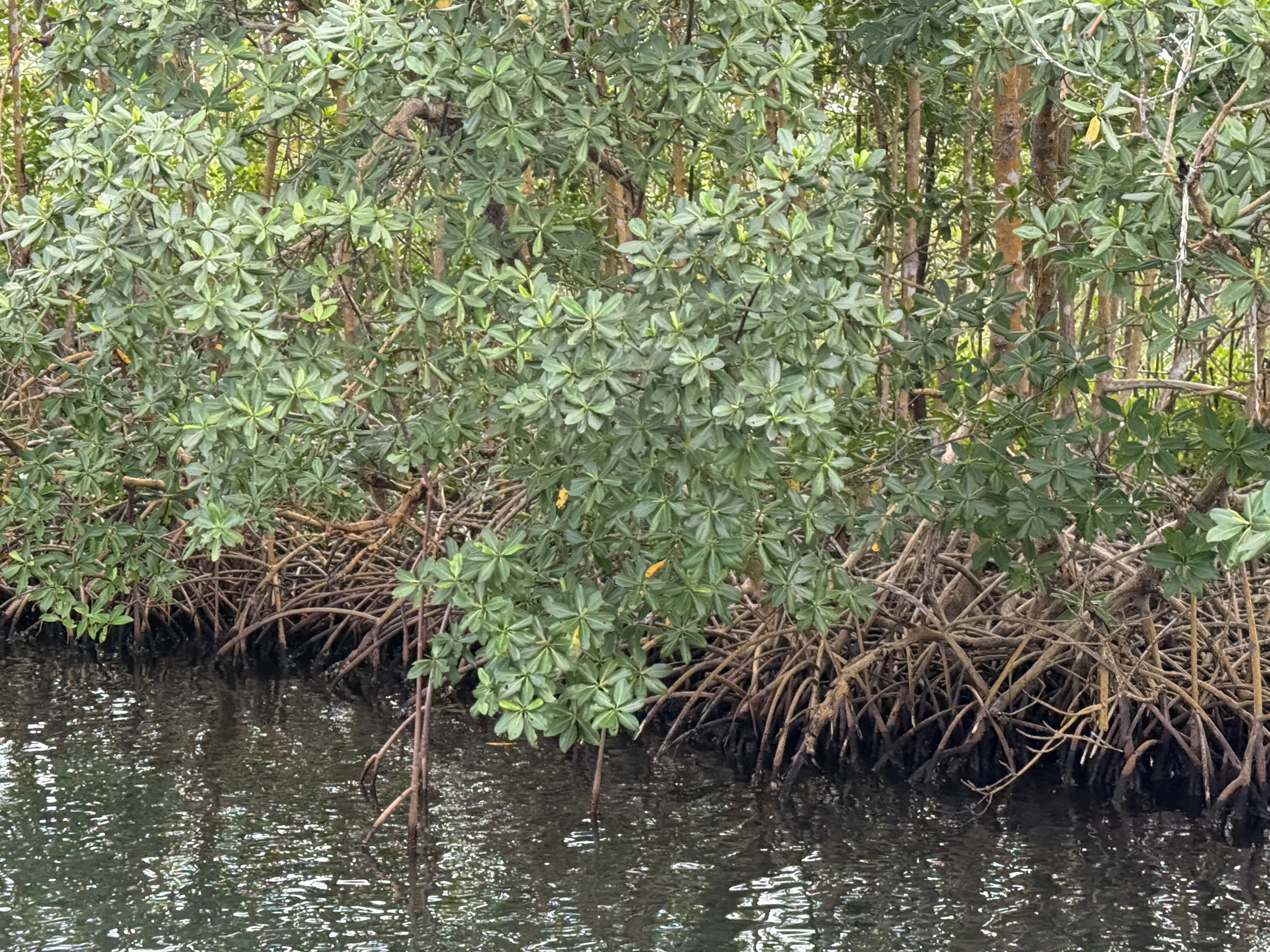 Our tour today was a snorkeling excursion at the marine park. We walked to the boat and went through the Salted River which is covered with mangrove trees on both sides. Our guide, Tom told us a lot about the mangroves which really protect the environment in many ways. The ones here are the red mangroves. If you look closely you can see what look like pods hanging from the branches. These separate and are able to float for a year before they take root and grow. When the leaves turn yellow, it means they are filled with salt – it is the way the trees get rid of salt.
