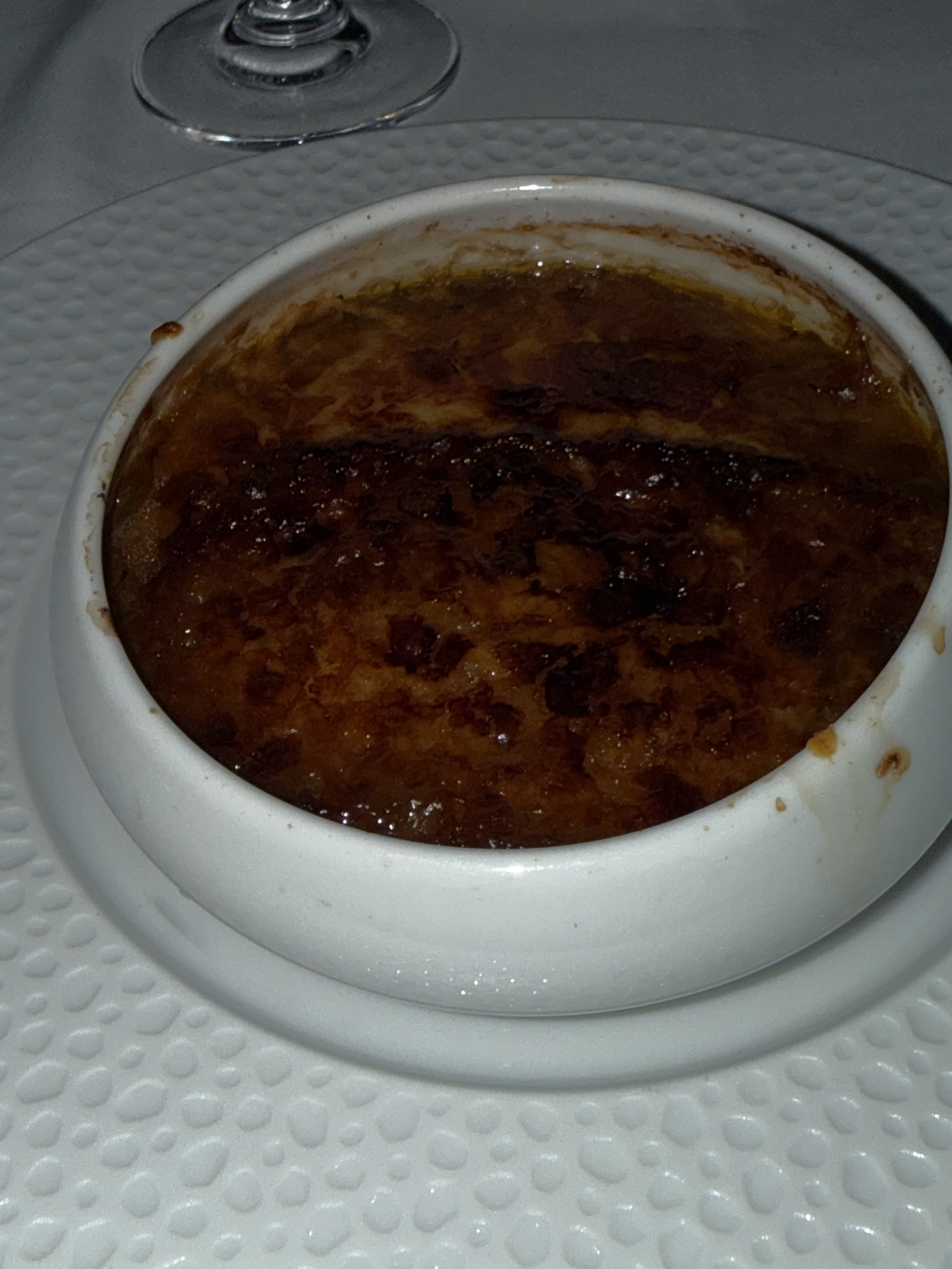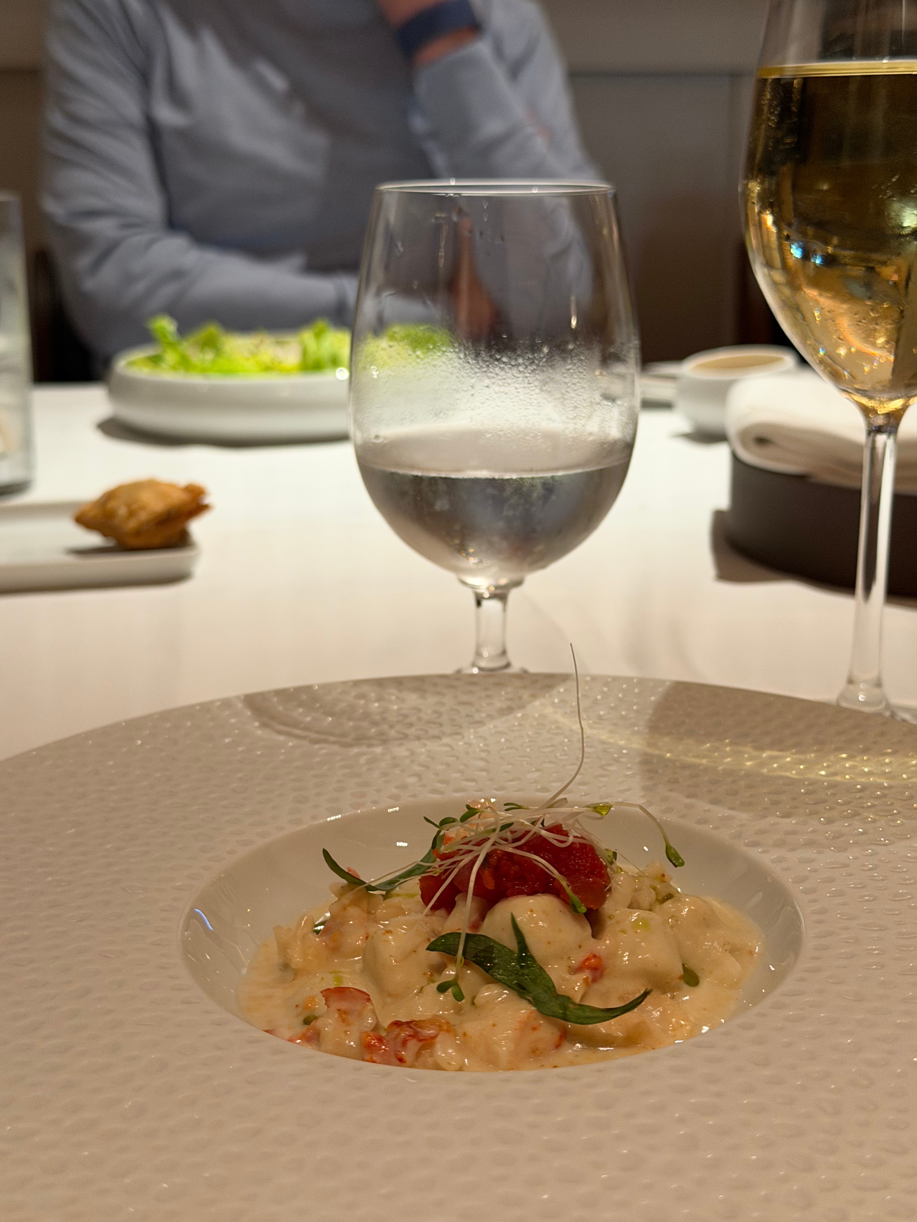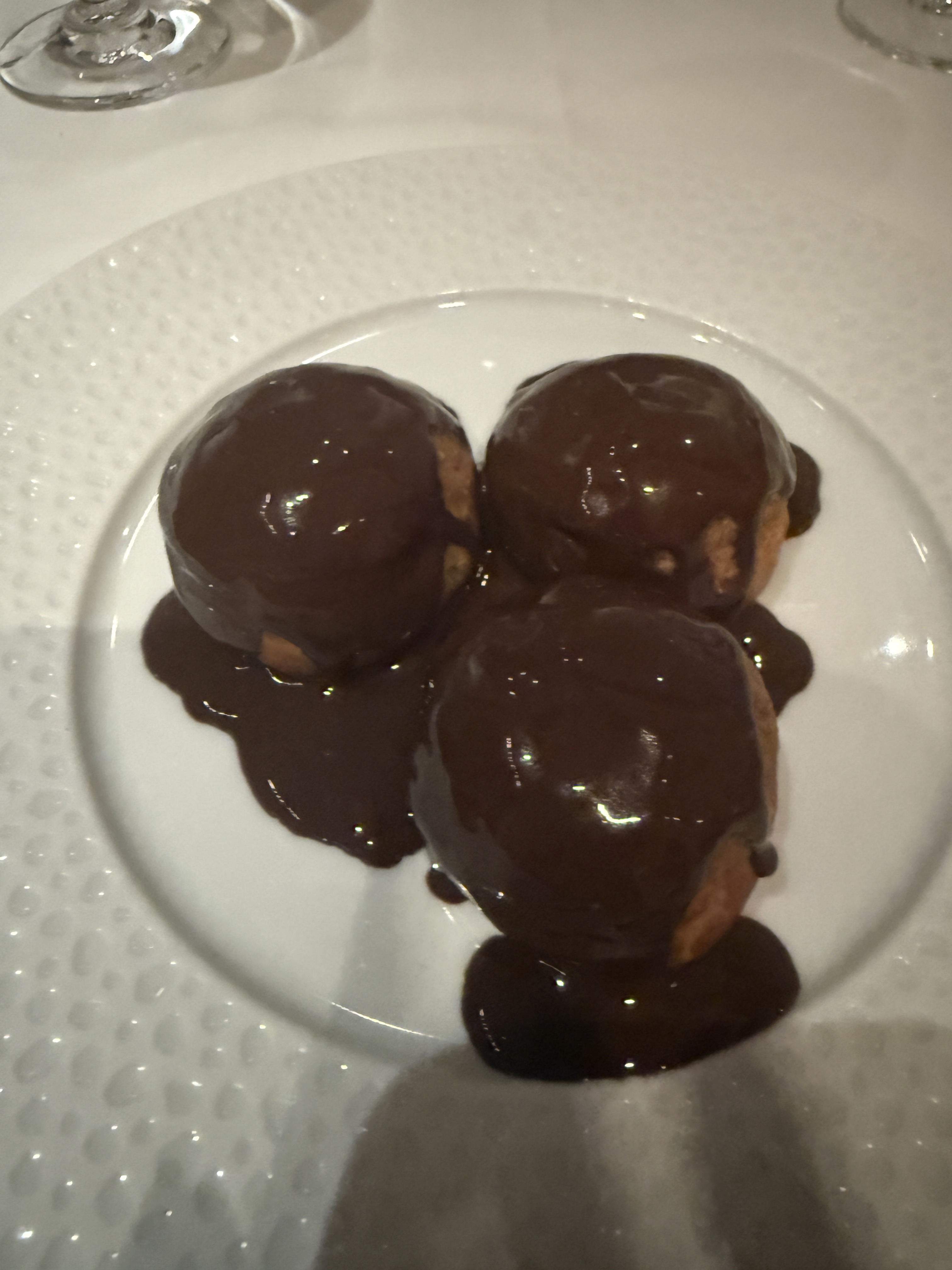 The Captain’s cocktail party was last night and it always gives us a chance to meet and greet the officers. After that, we went to dinner at Jacques. We shared the sea bass in puff pastry that Norm and I enjoyed on our three day cruise. Here are pictures of that and of a couple of the appetizers. Ramsay had the scallop dish and I had the French Onion soup.