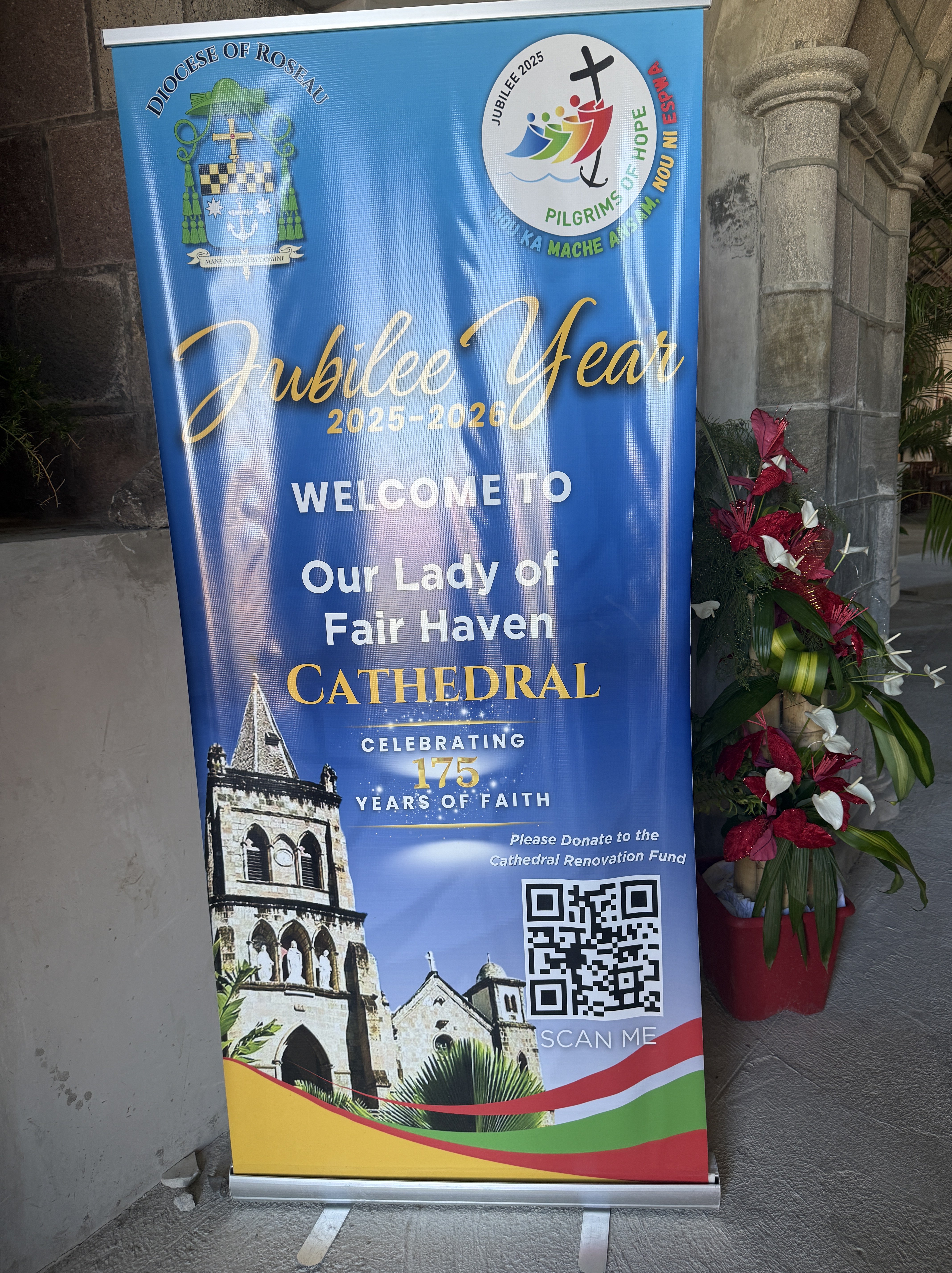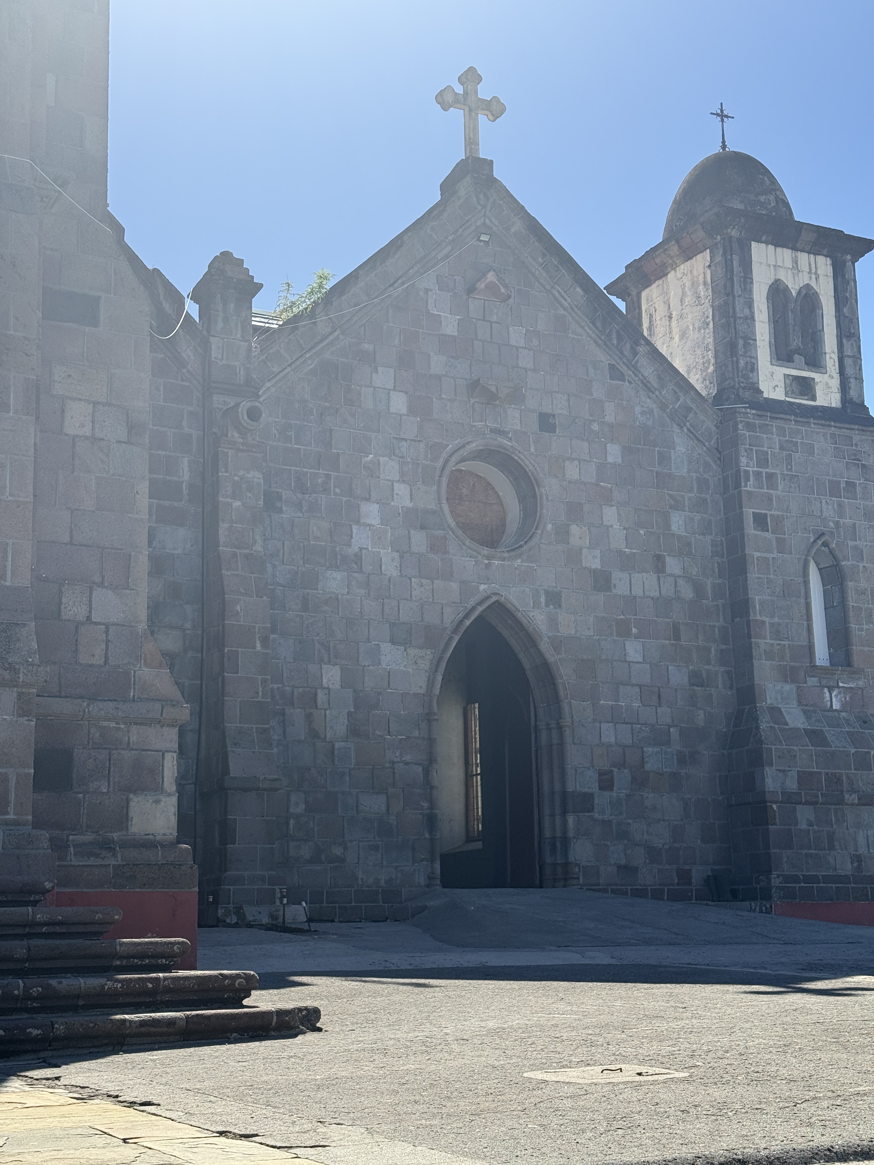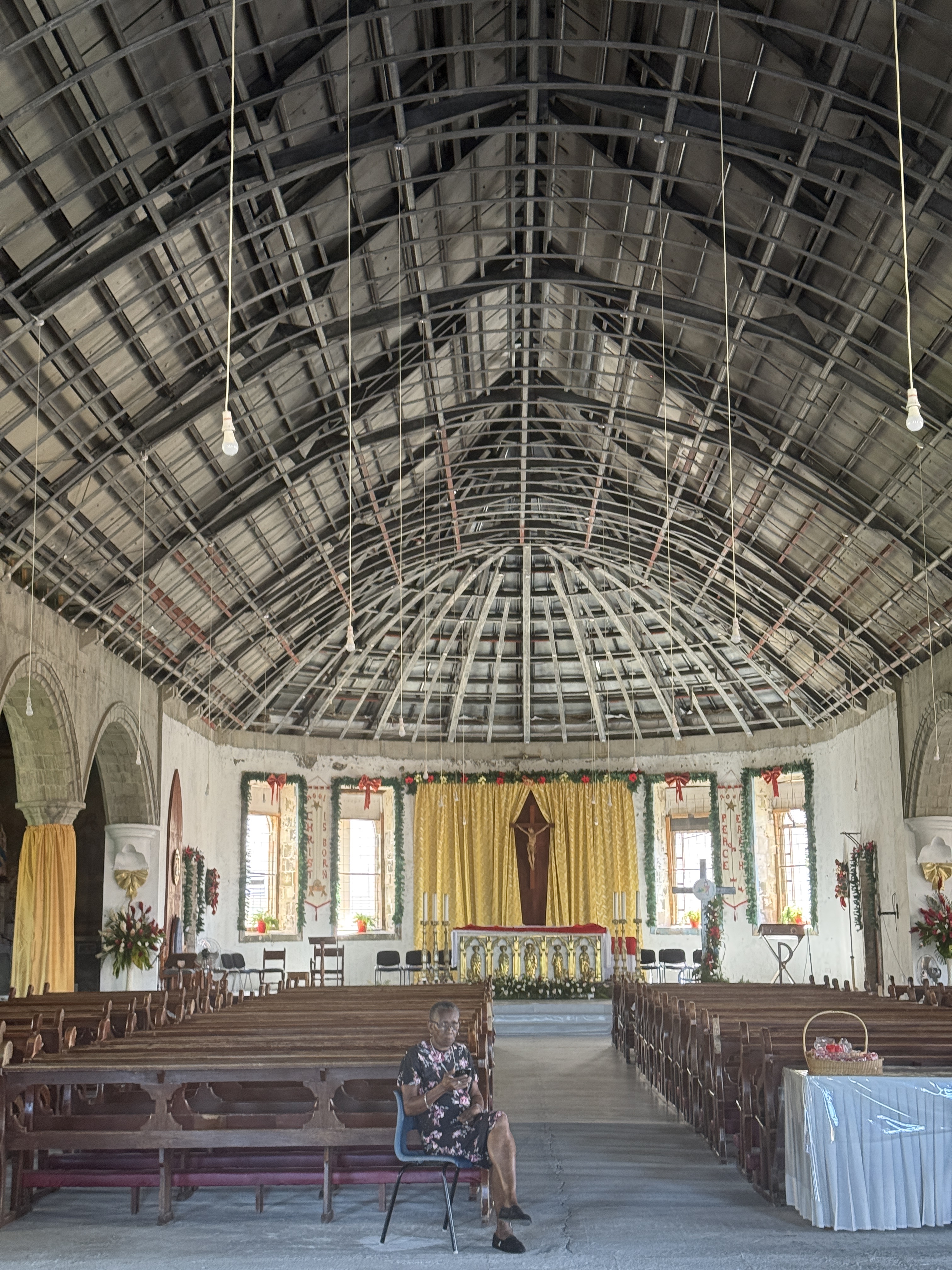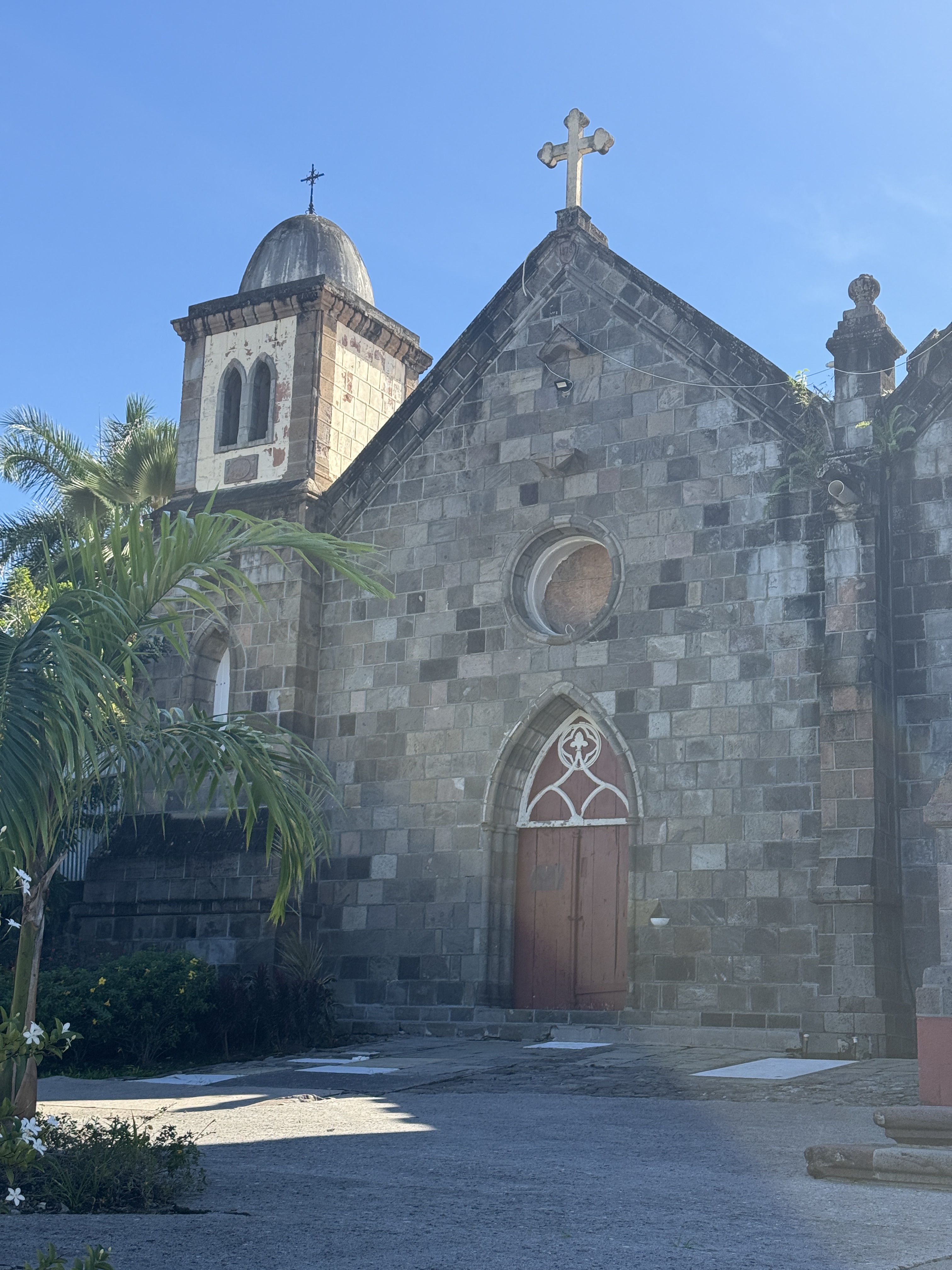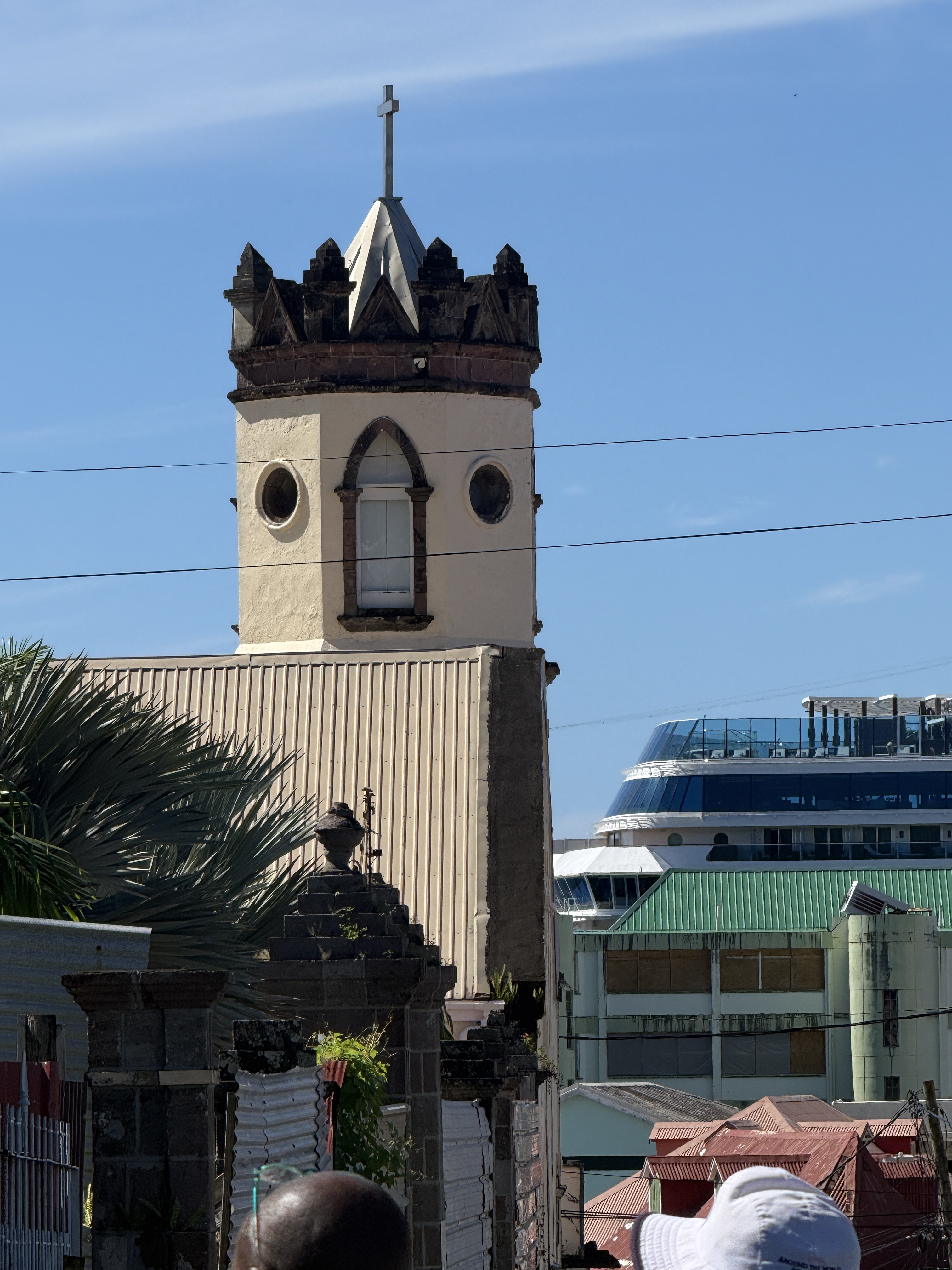 We headed back down towards the Roman Catholic Cathedral, Our Lady of Fair Haven, and wound around many streets. Some of them are pretty uneven. We reached the area of the church and stopped in to see how to get to it and a nice man took us there. He explained that hurricane Maria, a category 5 storm in 2017, caused major damage to the church buildings, stripping the roofs and severely damaging the buildings.
