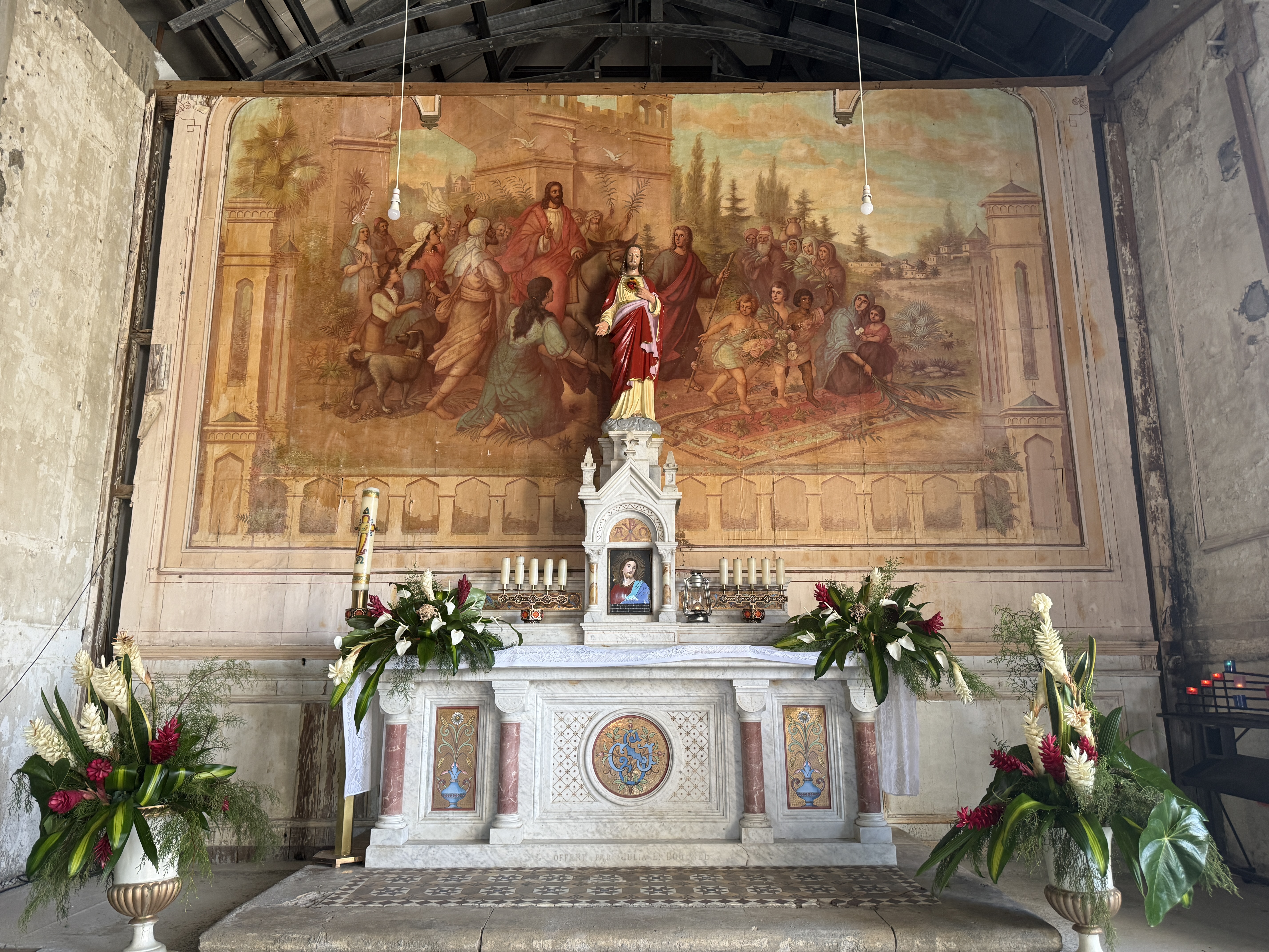 They are in the process of restoring the buildings with new roof structures, reinforced columns and retrofitted bell tower. Ongoing work to install a new spire and complete interior finishing has been delayed by tropical storms but they are persisting and the church remains open for services. We were happy to see it.