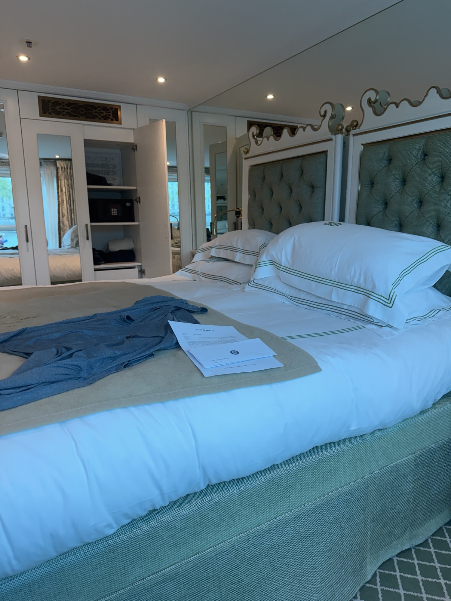 The train was very comfortable and fast. It was a 2 hour trip to Lyon. A bus picked us up to take us to the ship. Our rooms were not yet ready but we spotted our luggage. We had lunch and relaxed and soon our room was ready and we unpacked. Here is a picture of our room.
