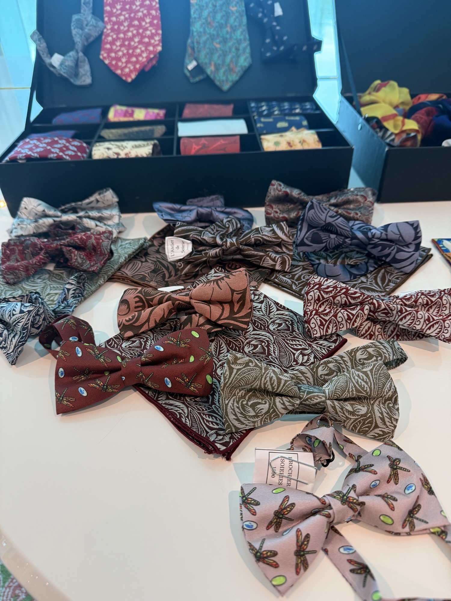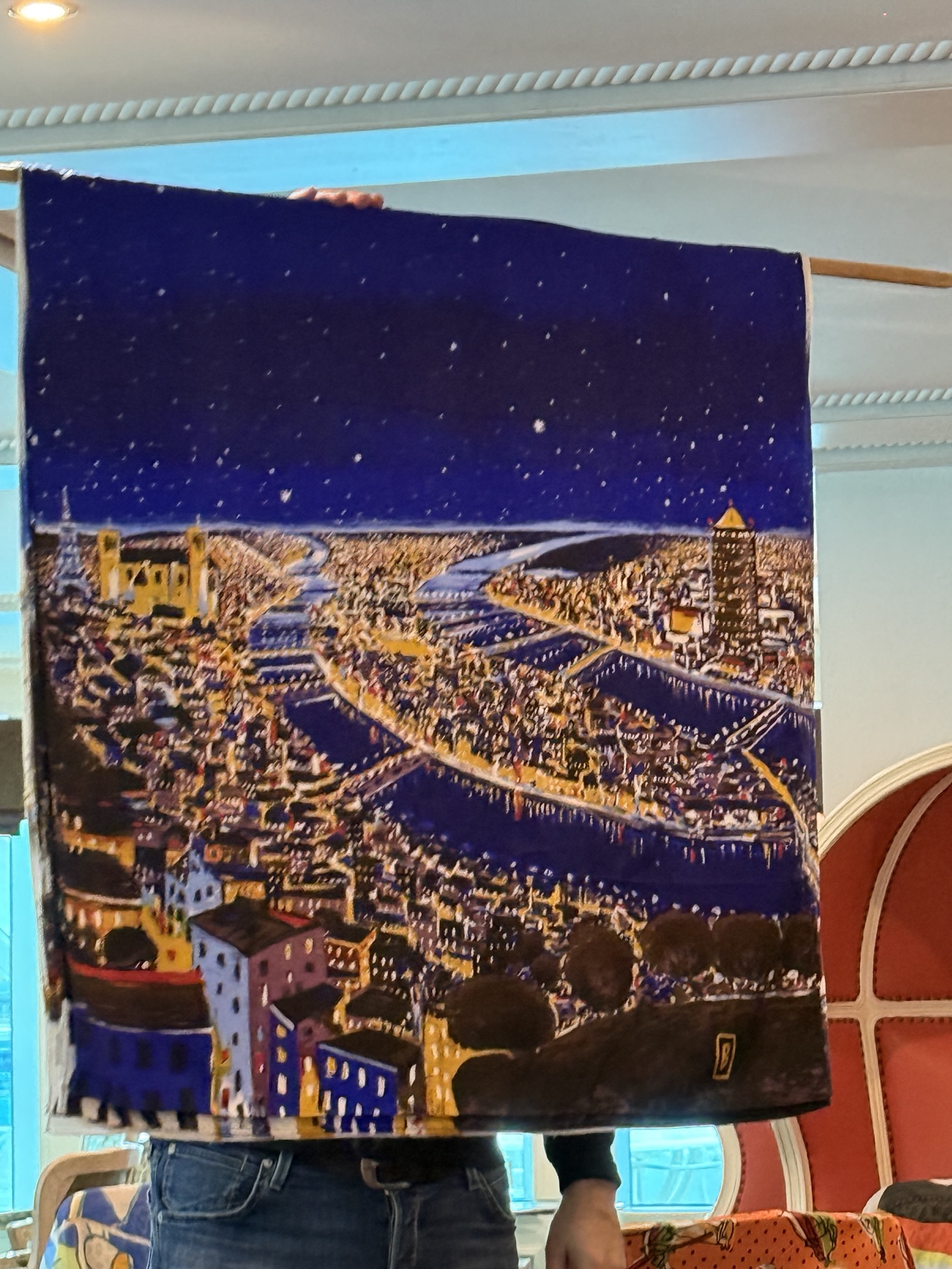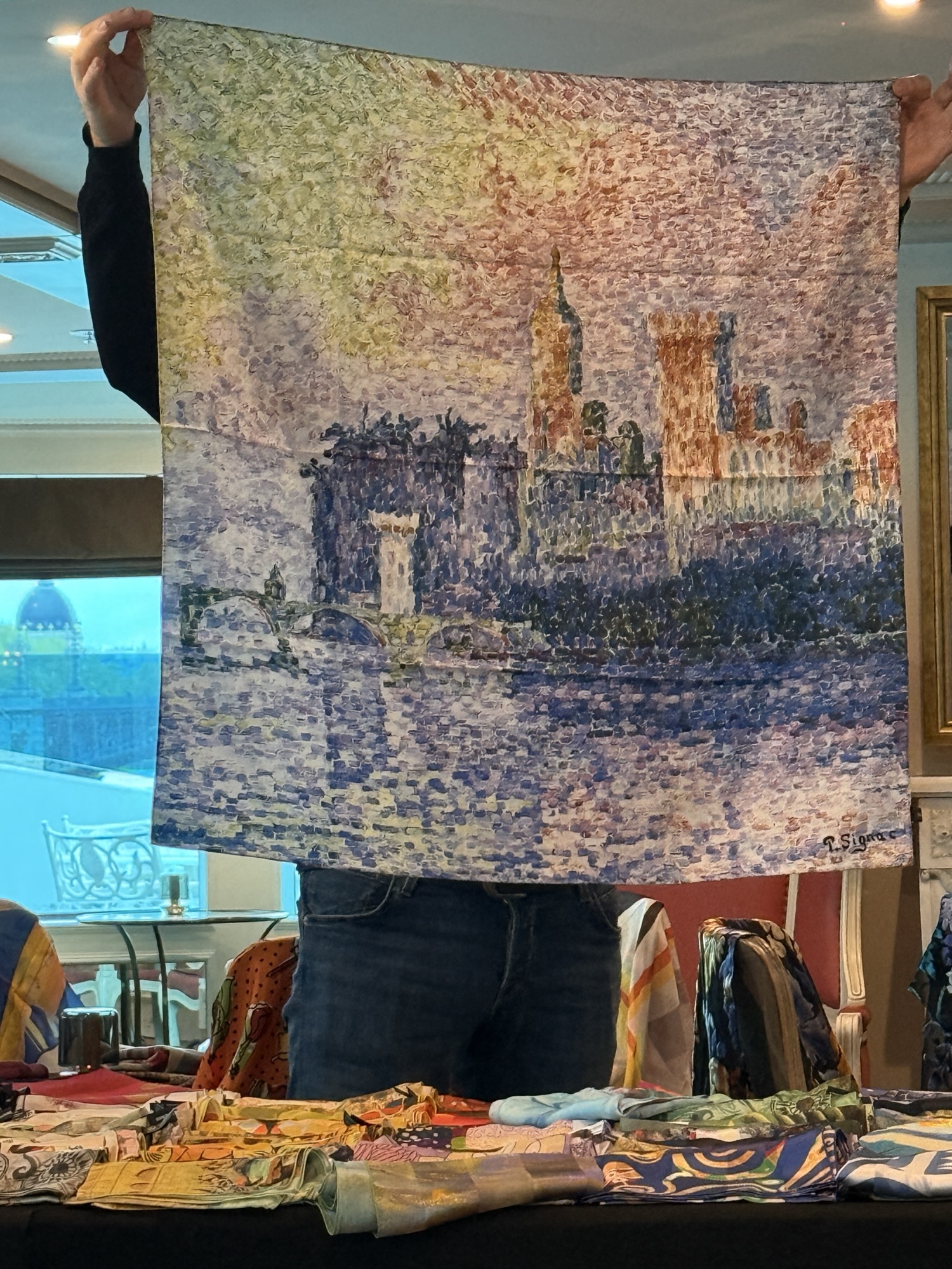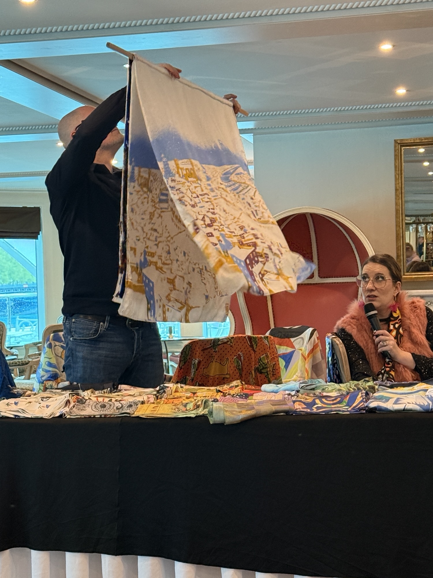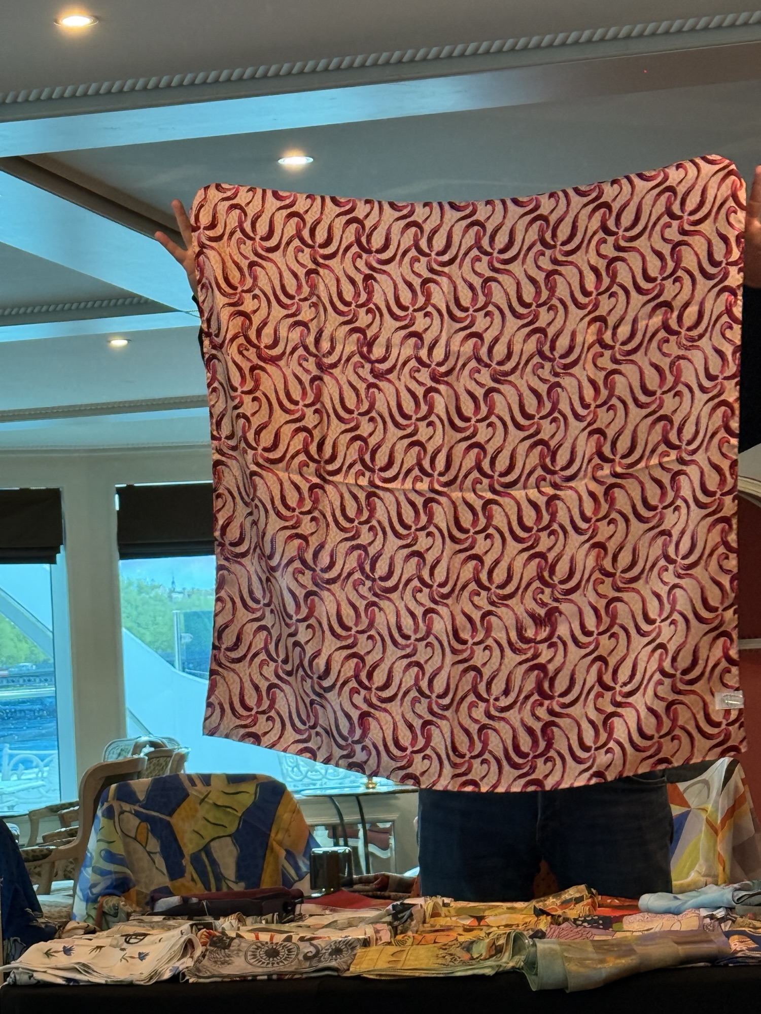 After lunch, the owners of the silk shop, Brochier Soieries, came to the ship to tell us about the Brochier family that has been handing down a tradition born in Lyon in the 16th century. They manufacture exceptional natural silk fabrics and printing artists scarves and neckties. Four generations followed one another since the creation of the factory. The collection has a wealth of more than 100,000 textile designs and they print products for the greatest museums in the world. They still use the hand silk screening technique and wood block printing for coloring their products. They gave a presentation with slides to show their process. It takes 500 silk worm cocoons to produce one small scarf!