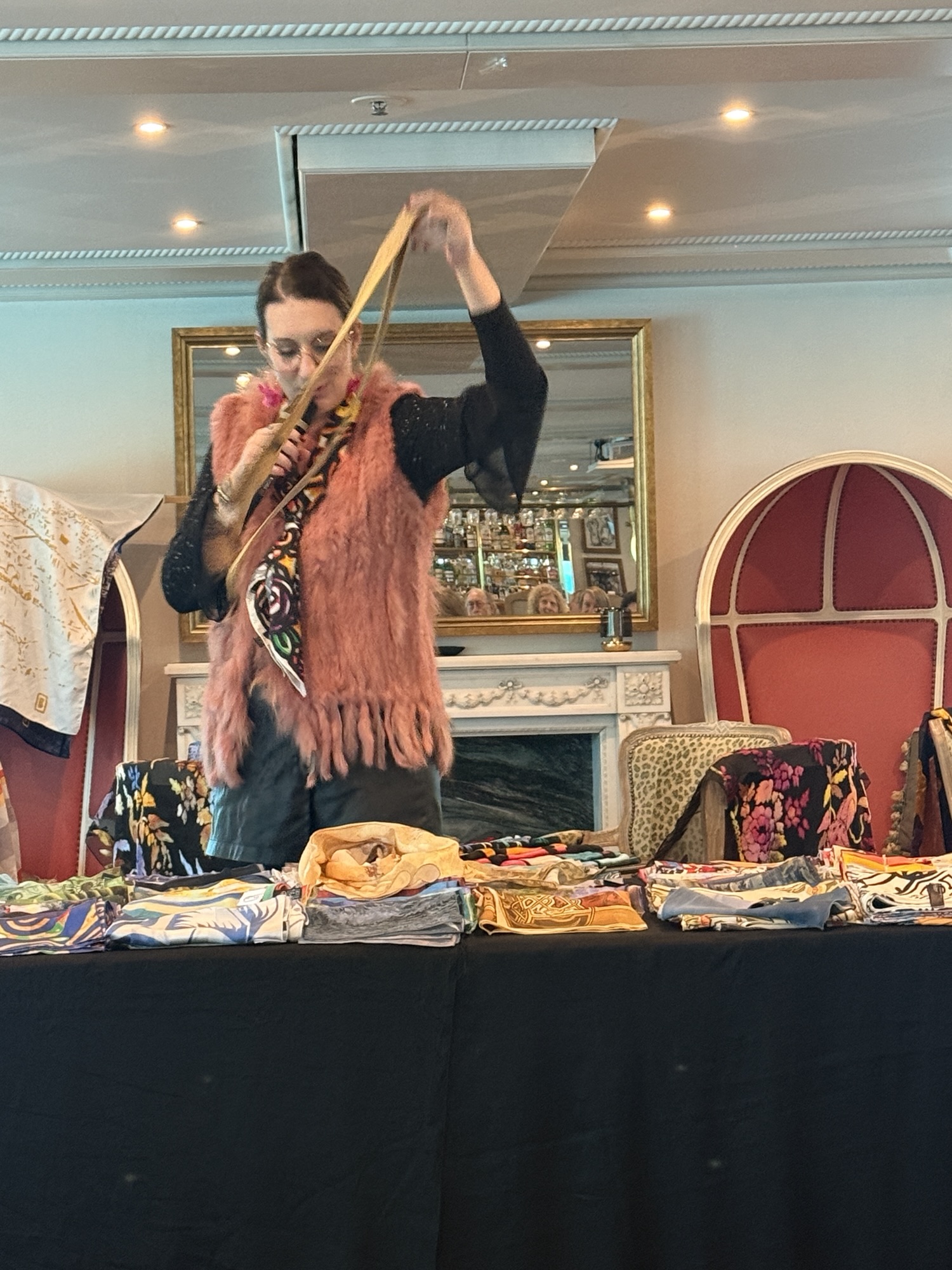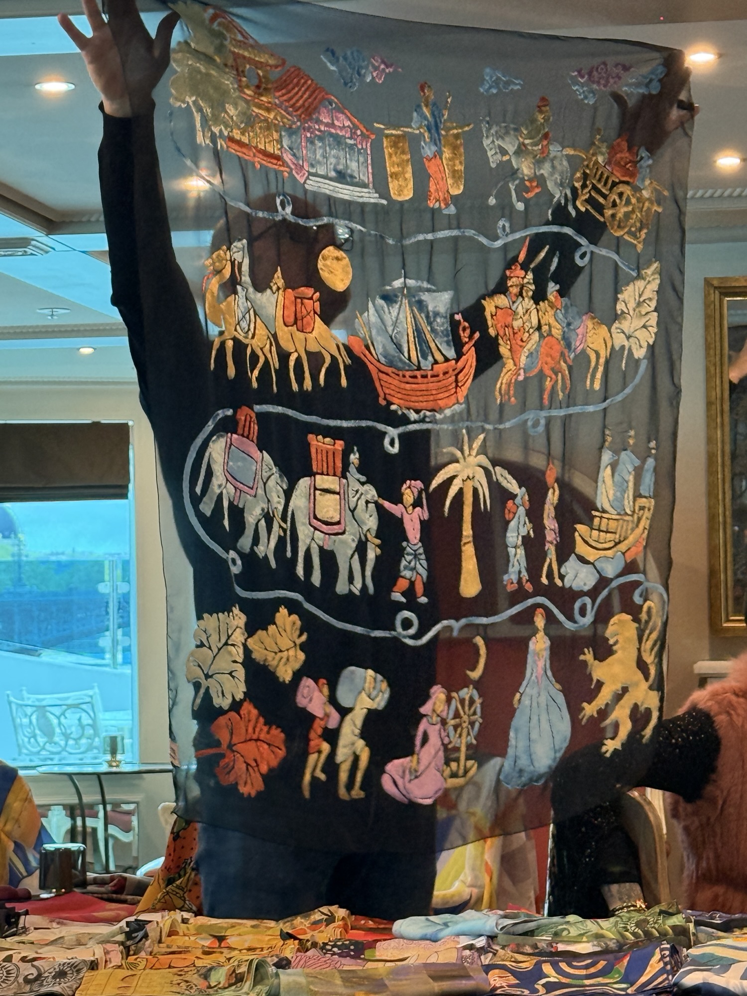 They brought many scarves to show us and showed how each layer of color is applied.