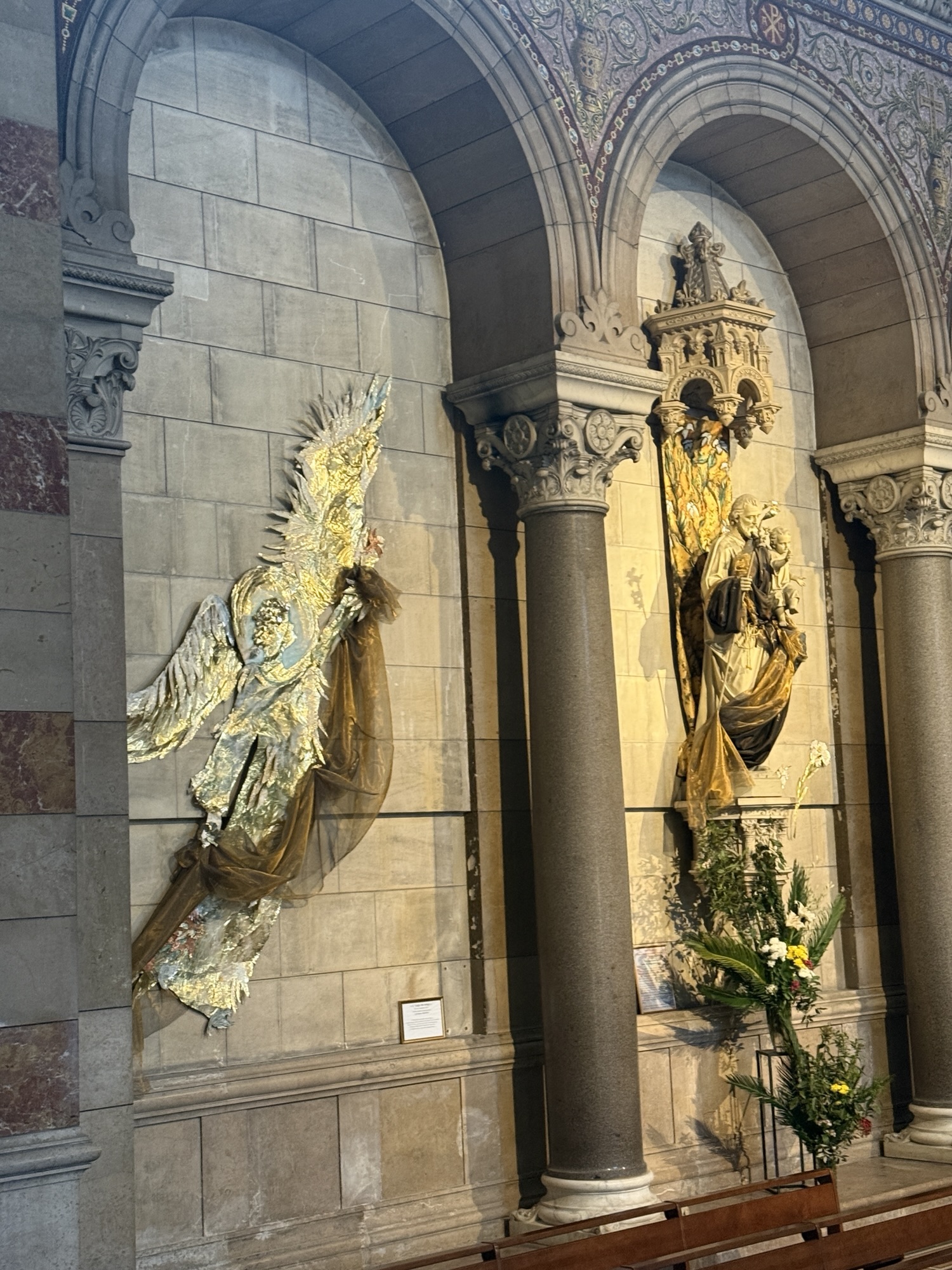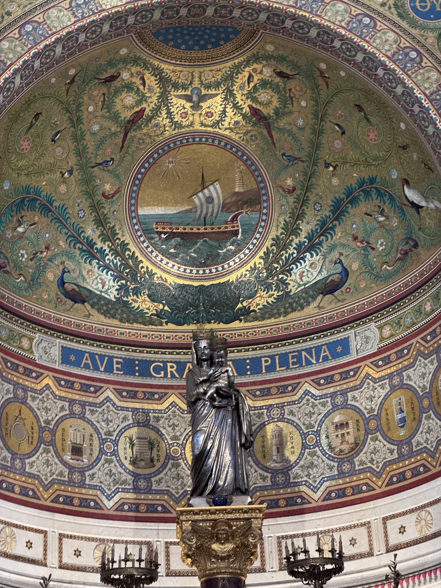 I could include so many more pictures, but you get the idea – it is a very special place with hundreds of colorful mosaics and many votive offerings. Atop the bell tower is a gilded statue of the Virgin Mary.