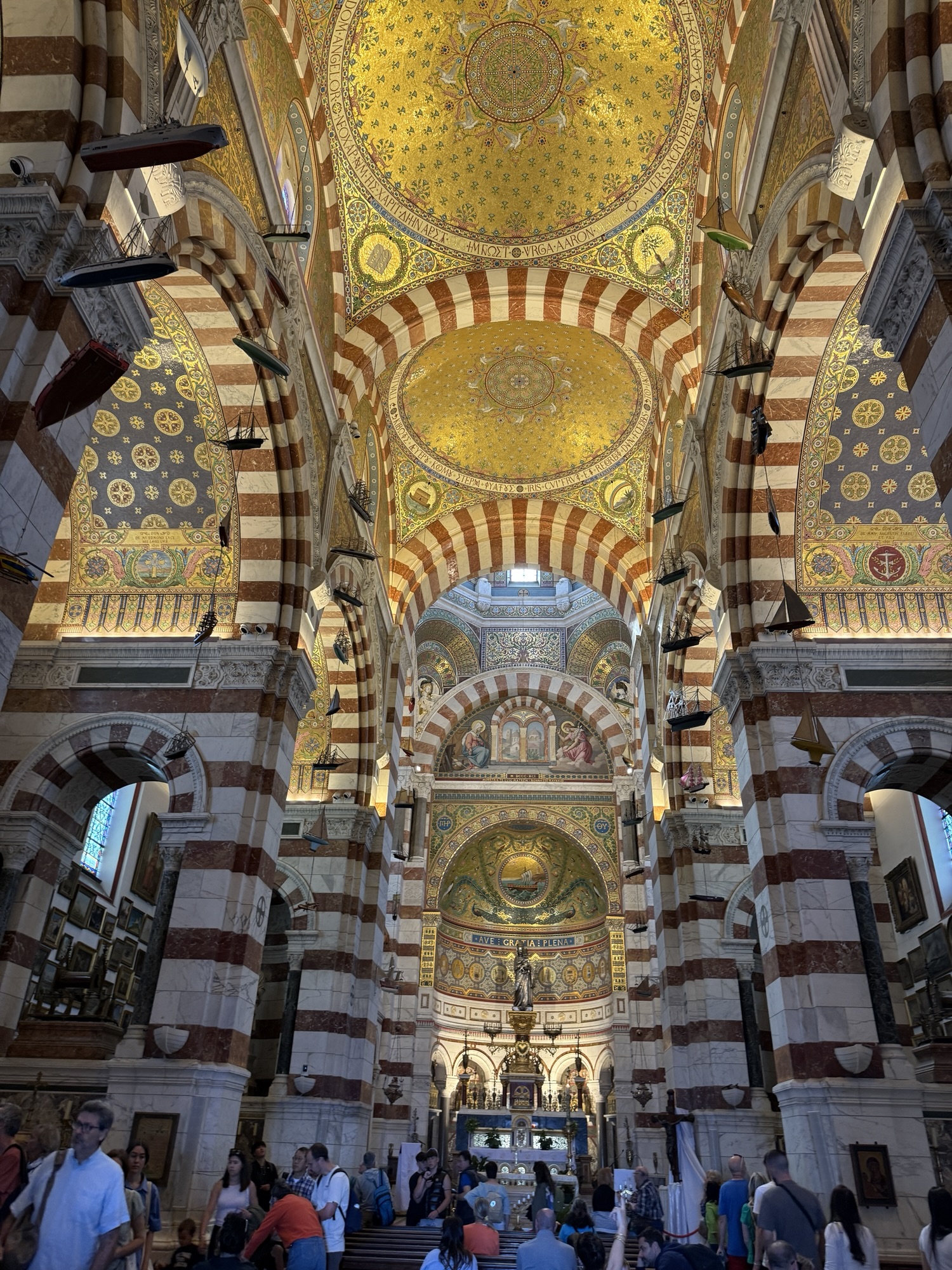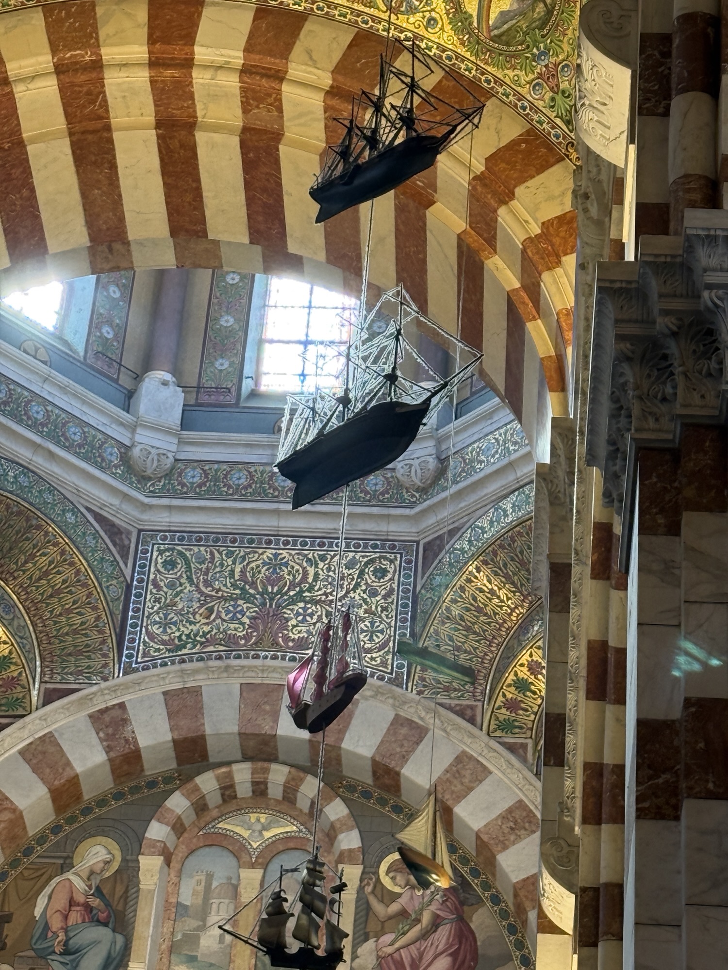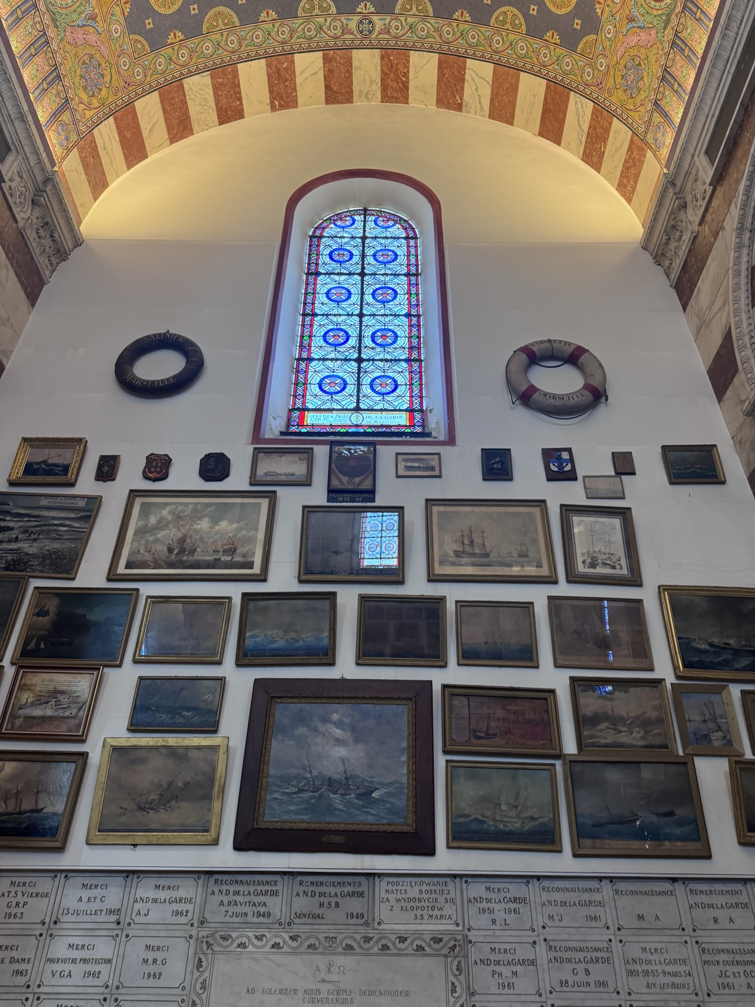 The church is located at the top of the hill of La Garde, the highest spot of the city. It was originally a lookout over the sea and housed a 13th century chapel that became a spiritual refuge for sailors. Later, Francois I built the Fort de la Garde in 1524 to defend Marseille from the troops of Charles V. The church is known affectionately as La Bonne Mere (the good mother). The walls are covered with pictures of maritime activities and there are ropes with small ship replicas hanging in the church.