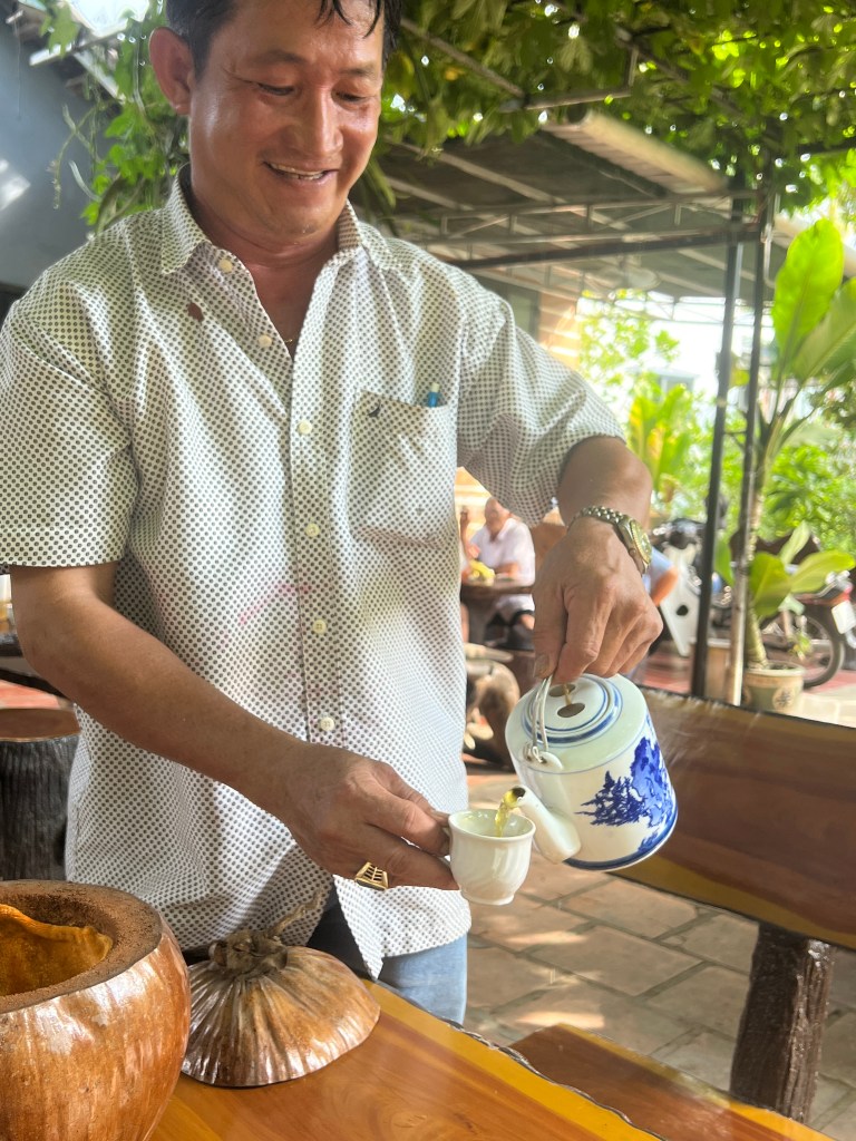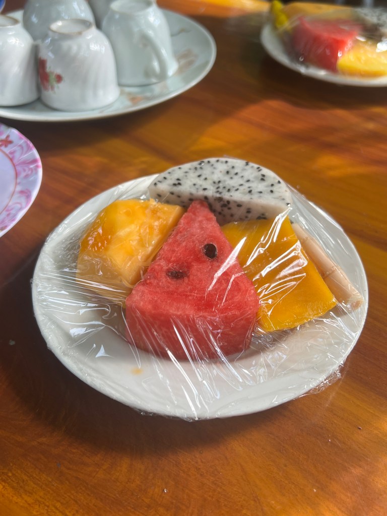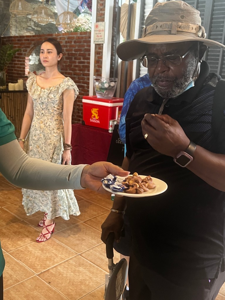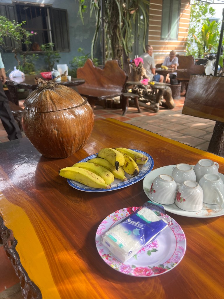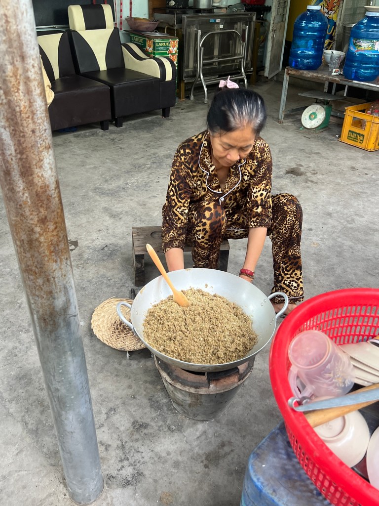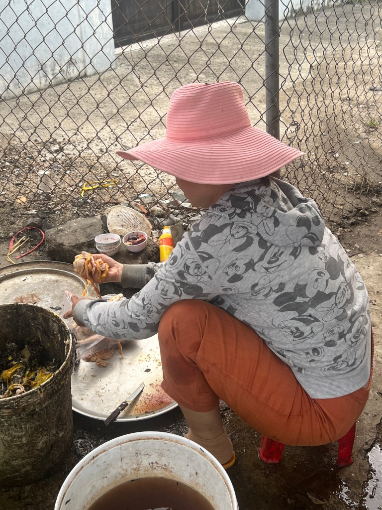 Our guide today was Tom. He toook us on a long drive into the countryside and to the town where he lives. I mentioned in previous blogs how many 7-Eleven shops there are here. This town was no exception. Our arrival into port was at 10:30 and we met him at 11. So, when we got to the town, he thought we could have lunch aat 7 -Eleven. They have everything in these stores here, including so many selections of food that they cook for you. But we really wanted to sit in a restaurant. Tom knew the town well so he took us across the street to what turned out to be a duck restaurant. There were only local people in the place and there was no English menu so it was a good thing he was with us. I had a rice noodle soup with just vegetables and lemon grass and others had soups with meat or rice with pork or duck.