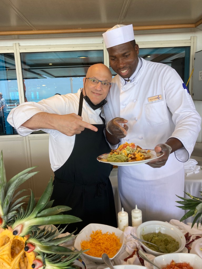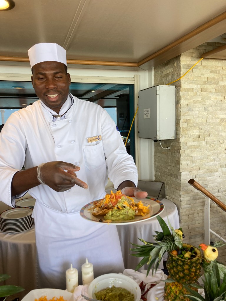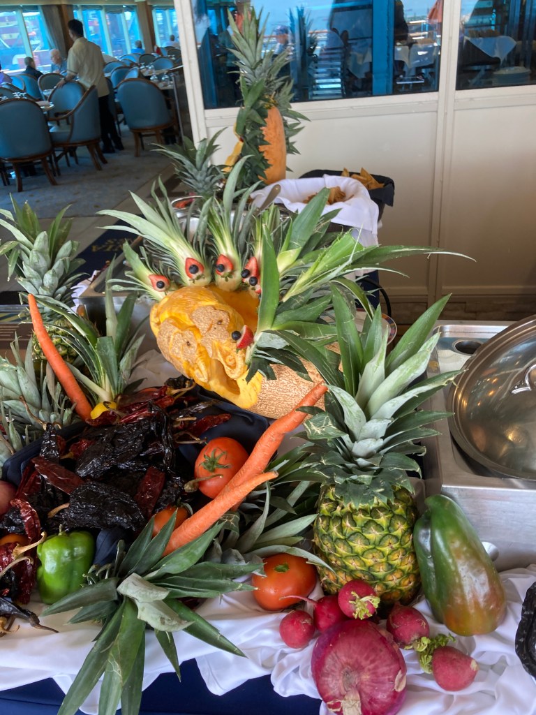 We got back at 8 PM which was the time the ship was supposed to leave (a good reason to take ship sponsored tours), so they pulled out just minutes after we got back. We were very hungry so had a quick dinner, I had a shower and we went to the show which was “Broadway” by our entertainment team singers. It was very good.