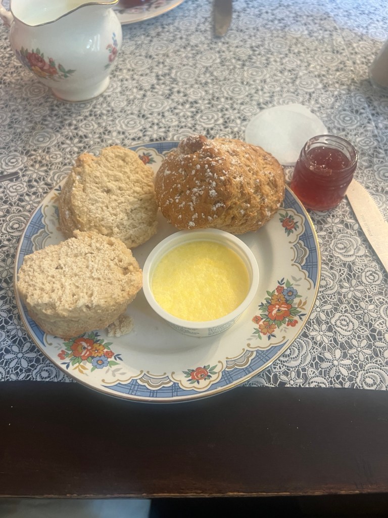 Norm wasn’t sure what clotted cream was (I have had it before and loved it!) For those who don’t know, here is the description Demaris gave us. Clotted cream is a thick, rich, and indulgent dairy product with a high fat content, typically made by heating unpasteurized cow’s milk and then allowing it to cool slowly. This process causes the cream to rise to the surface and form “clots” or thick cream. It has a smooth, velvety texture and a slightly sweet flavor. Clotted cream is a traditional accompaniment to scones and jam in the English tradition of cream tea, and it’s also used in desserts and baking.