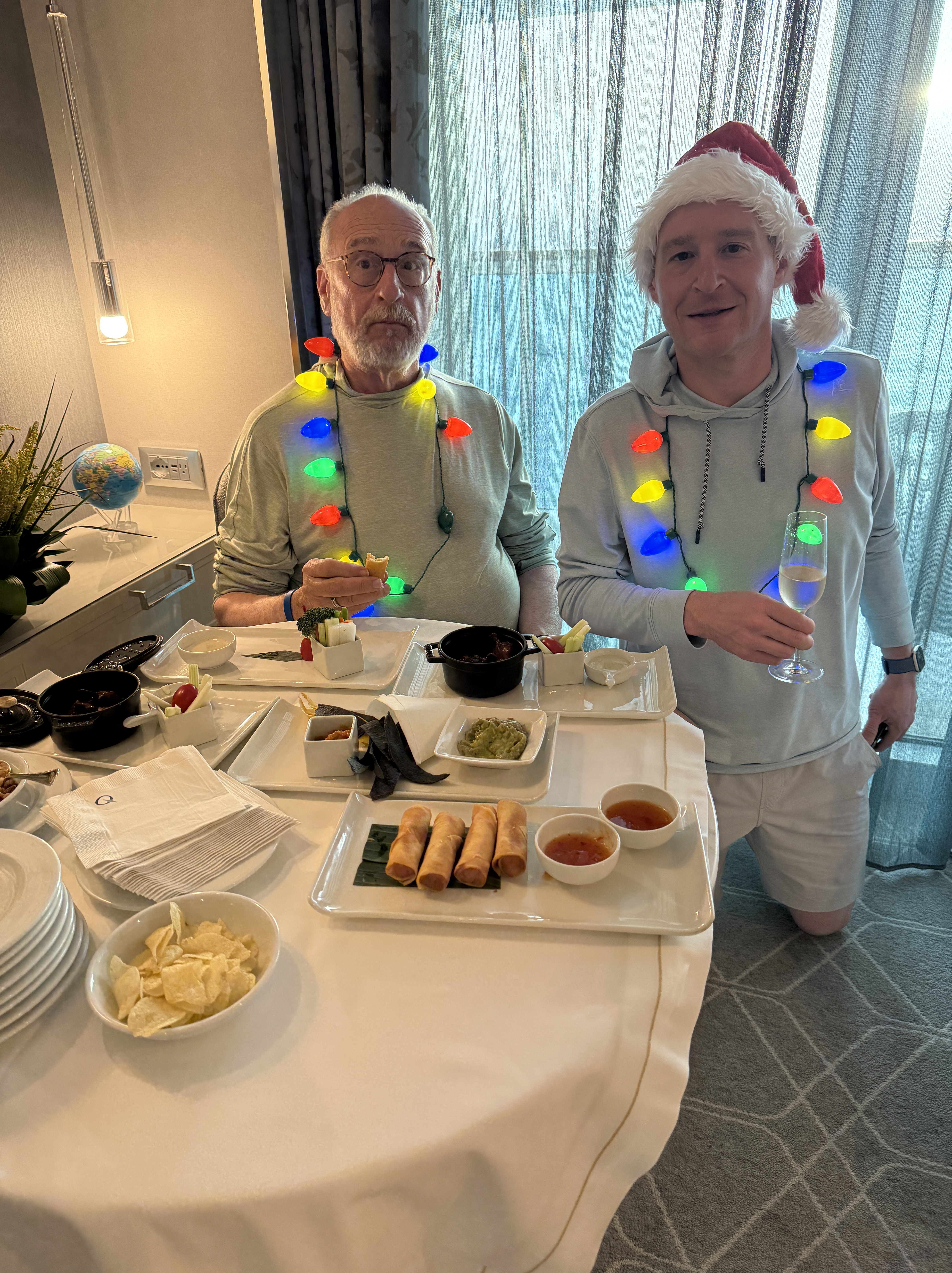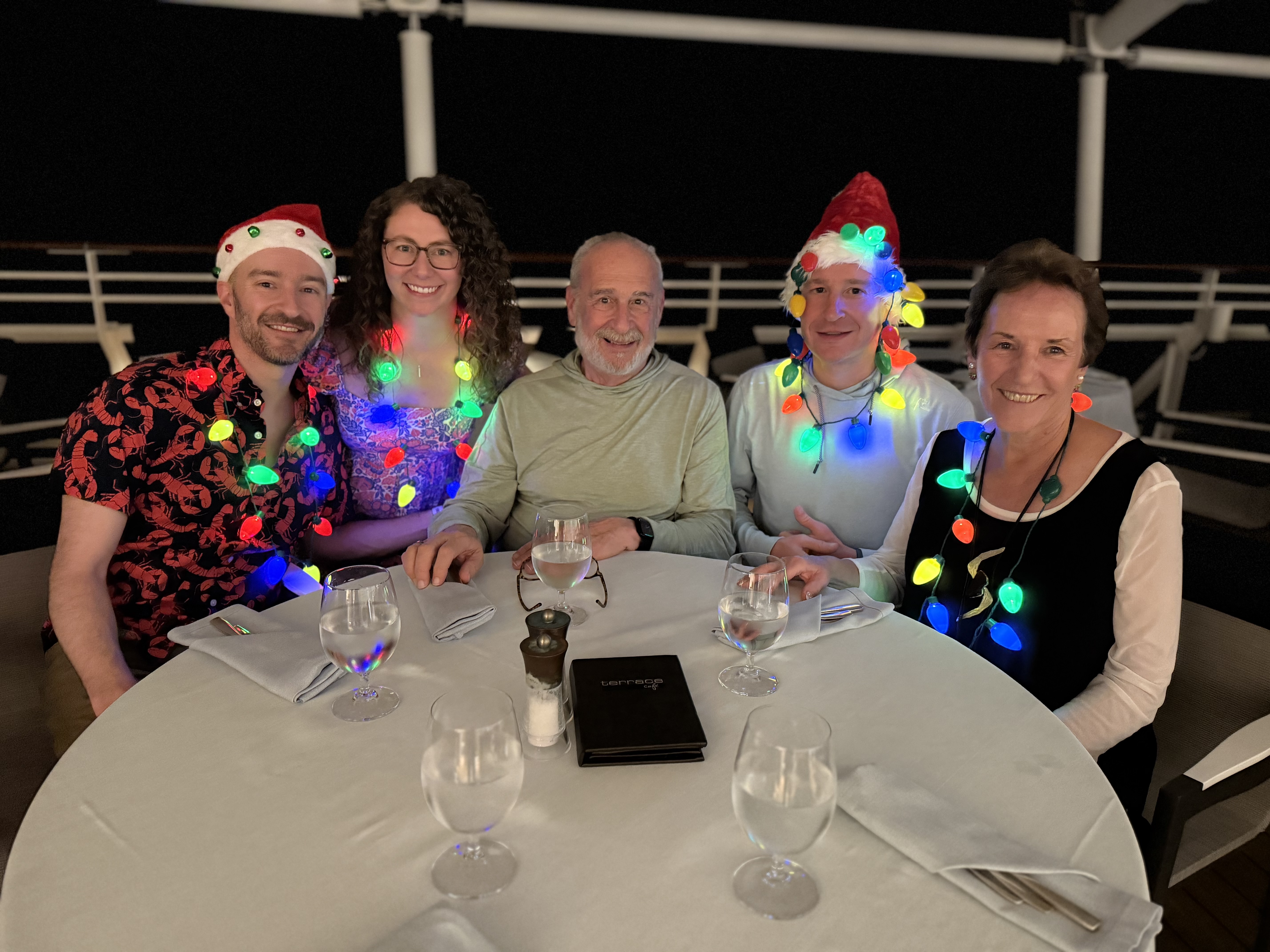The entertainment staff presented a special holiday show tonight and at the end many of the ship’s staff came on stage and sang with us. Afterward, they lined the hall as we left the theater and clapped for us!