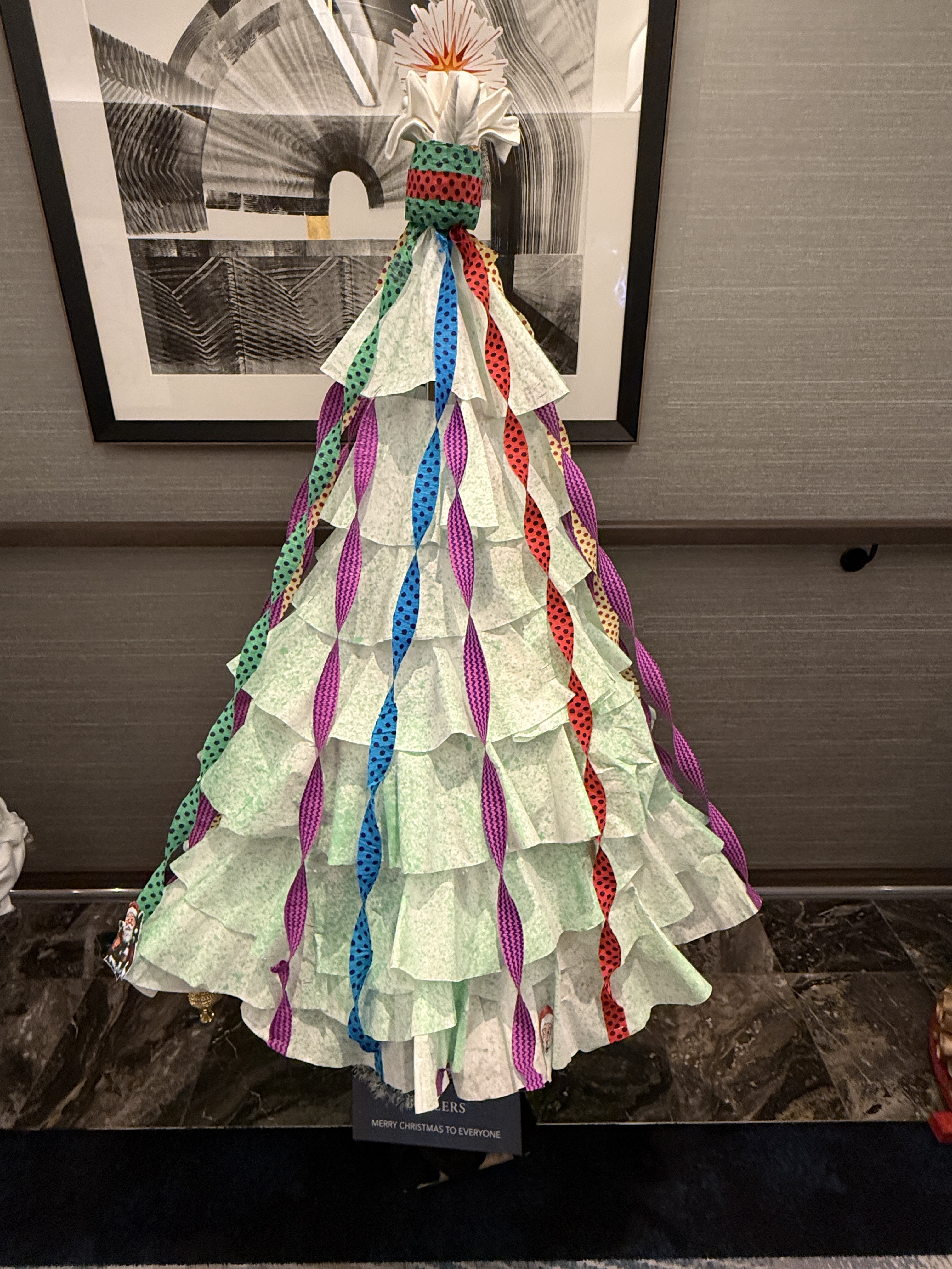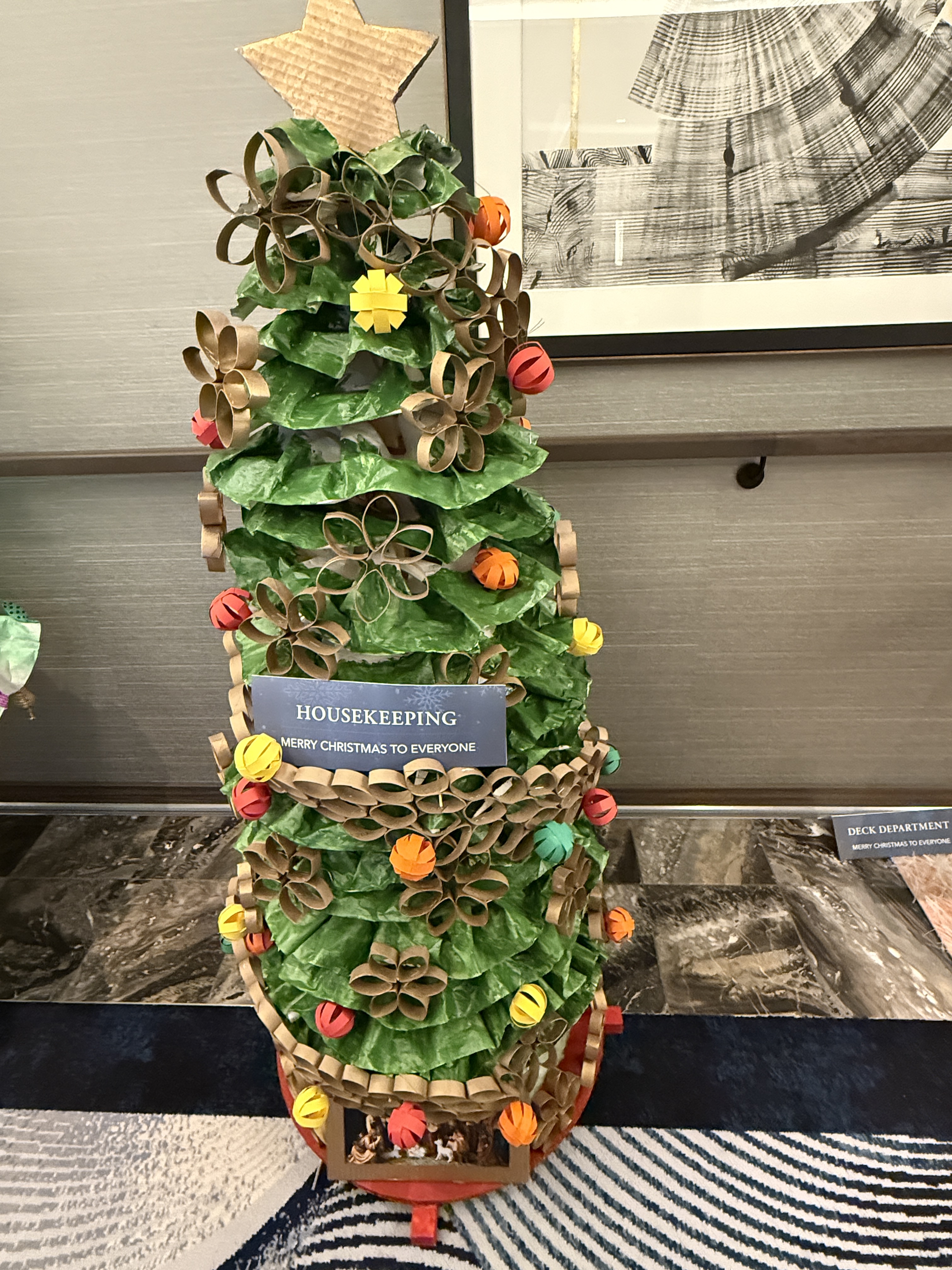 Some of the ship’s departments use their imaginations to create Christmas trees. Here they are on display.