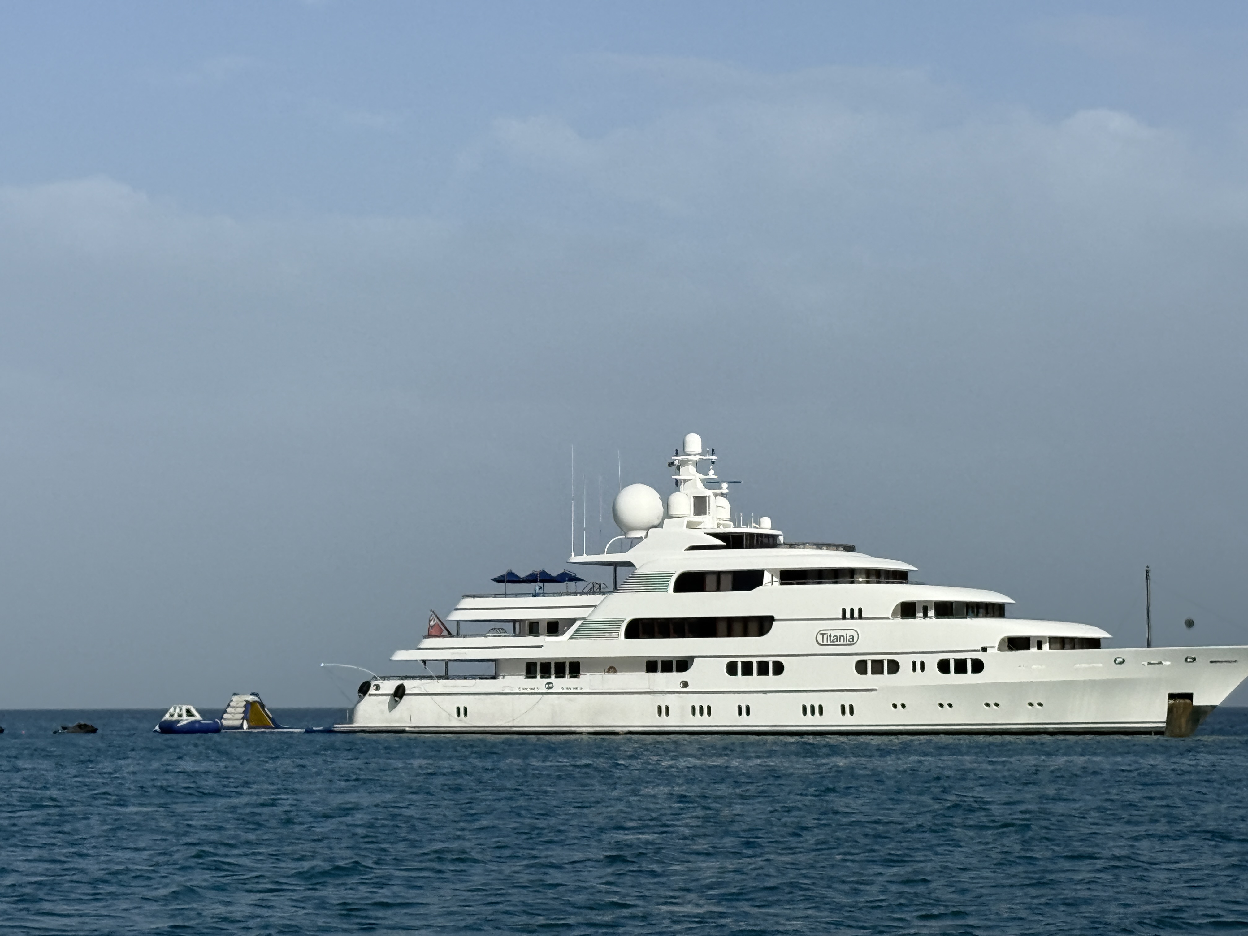 Last night, it was dark when we left St. Barts and it was fun to see all the yachts in the harbor beautifully lit up. Of course, the Bezos yacht was there. Is it following us?