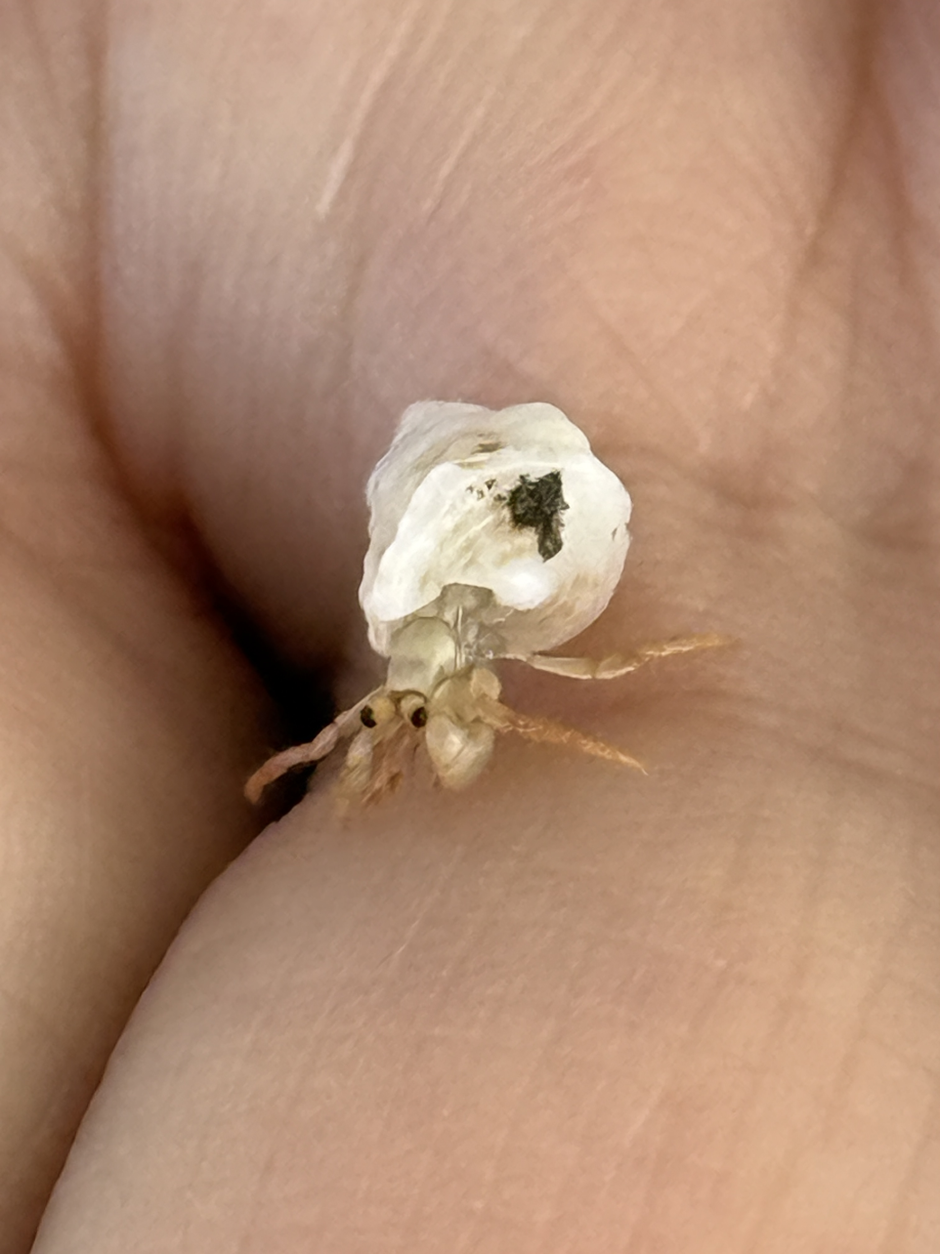 This tiny shell had a tiny crab inside! You can see it is on one of my fingers. It is only about 1/2 inch long.