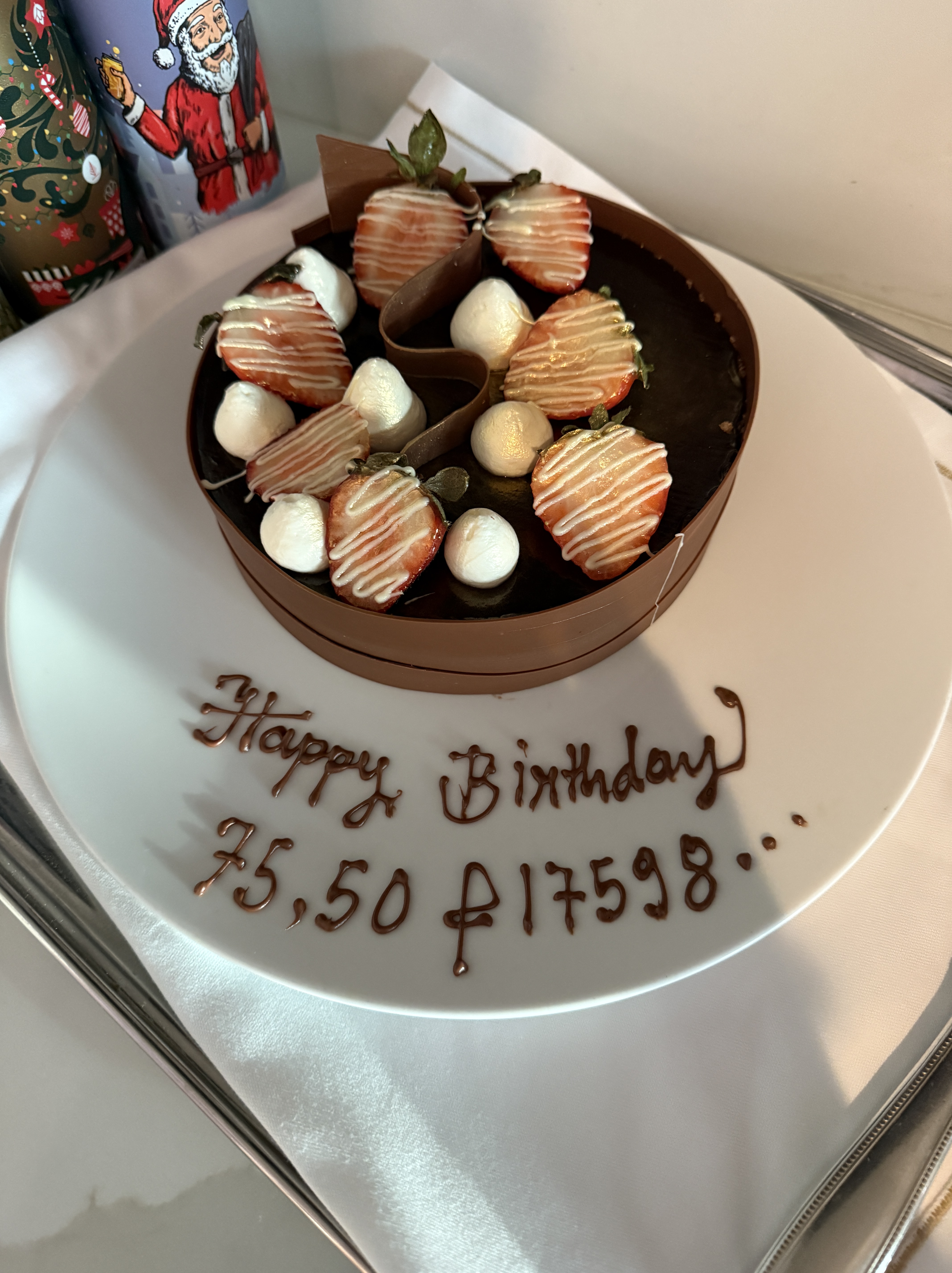 Our Christmas Eve plan was to have a cocktail party in our room with the family. Our butler, Atanu, brought all kinds of goodies. I arranged to have a cake to represent many wonderful things in all of our lives.