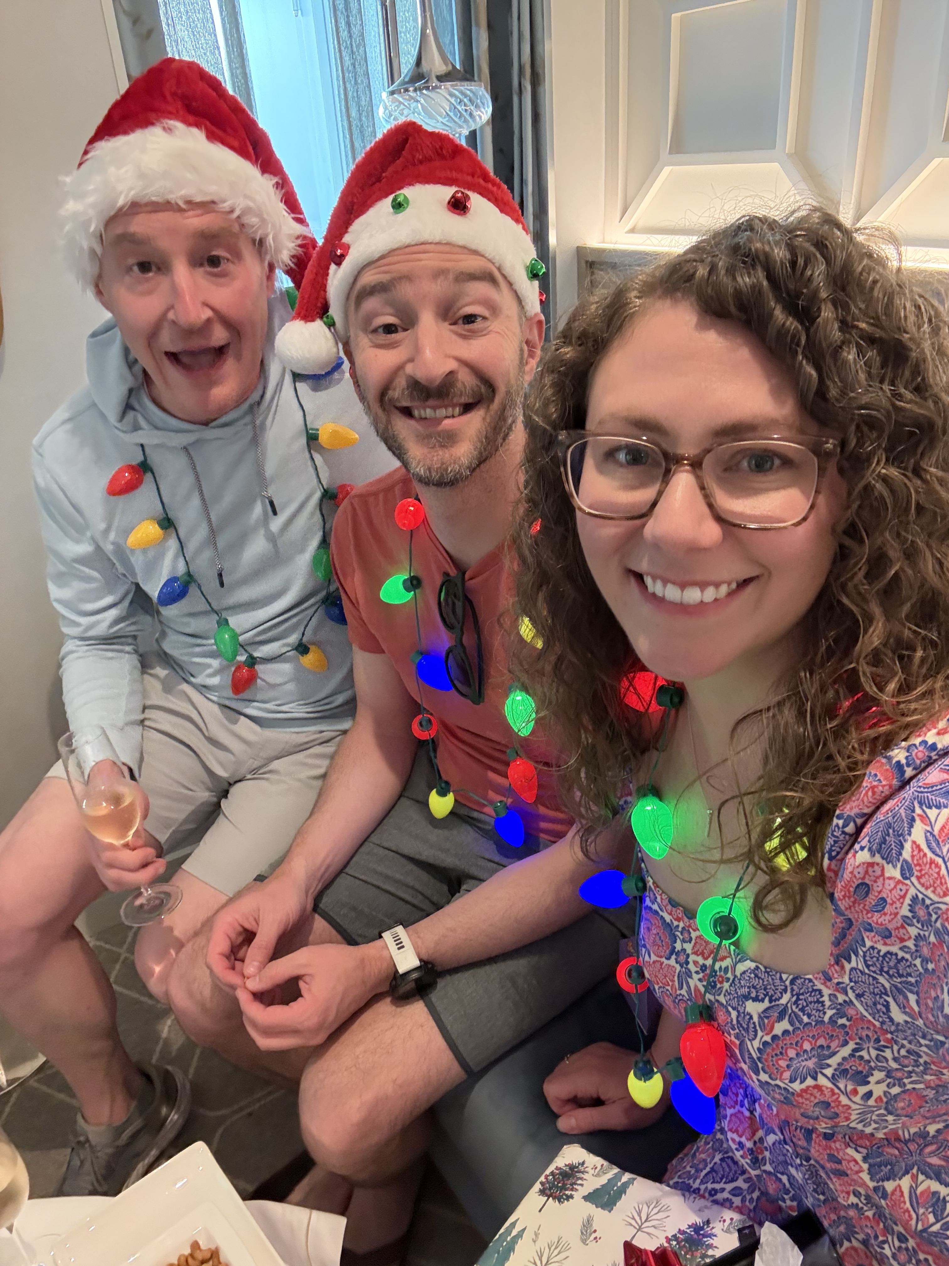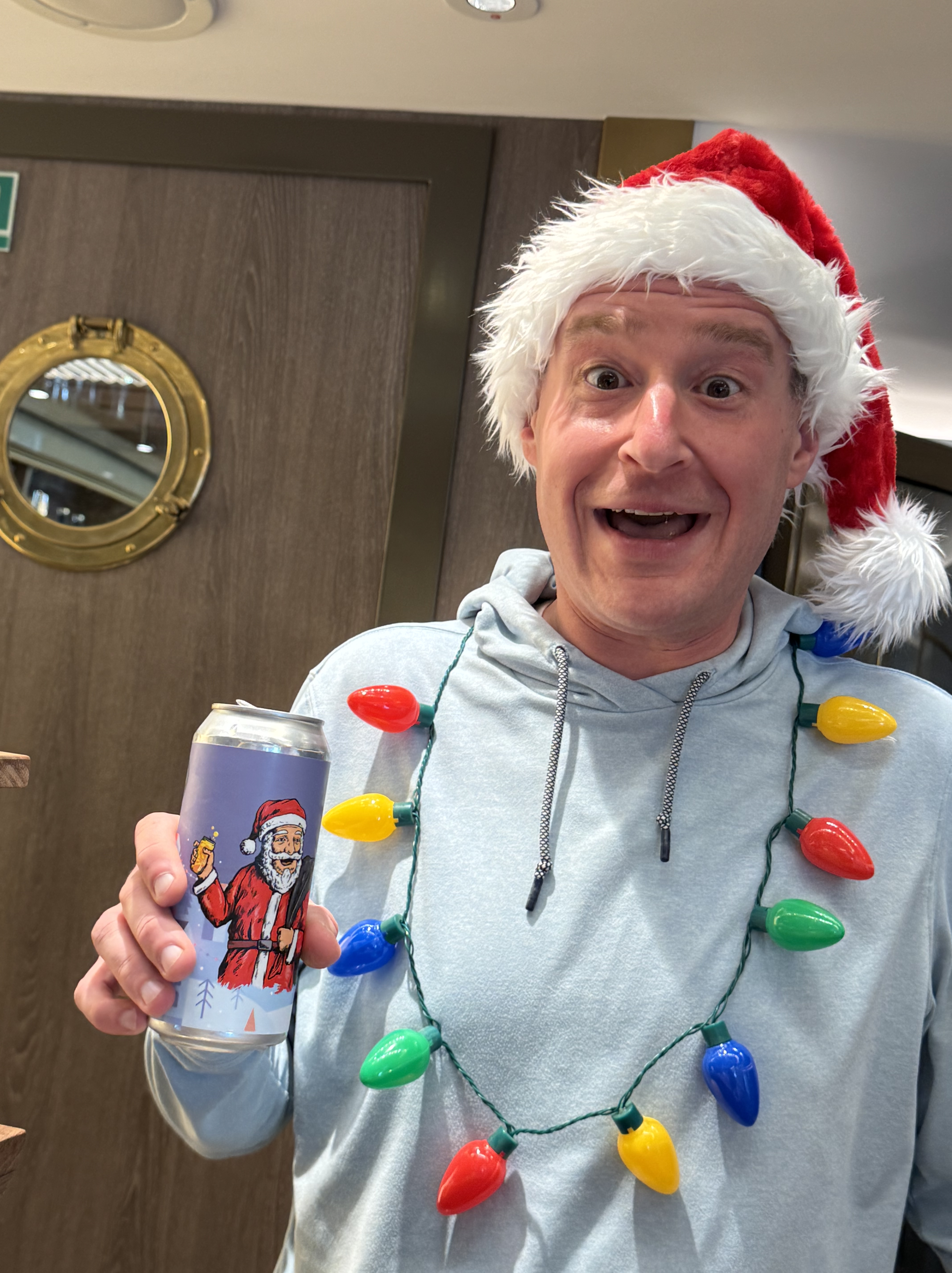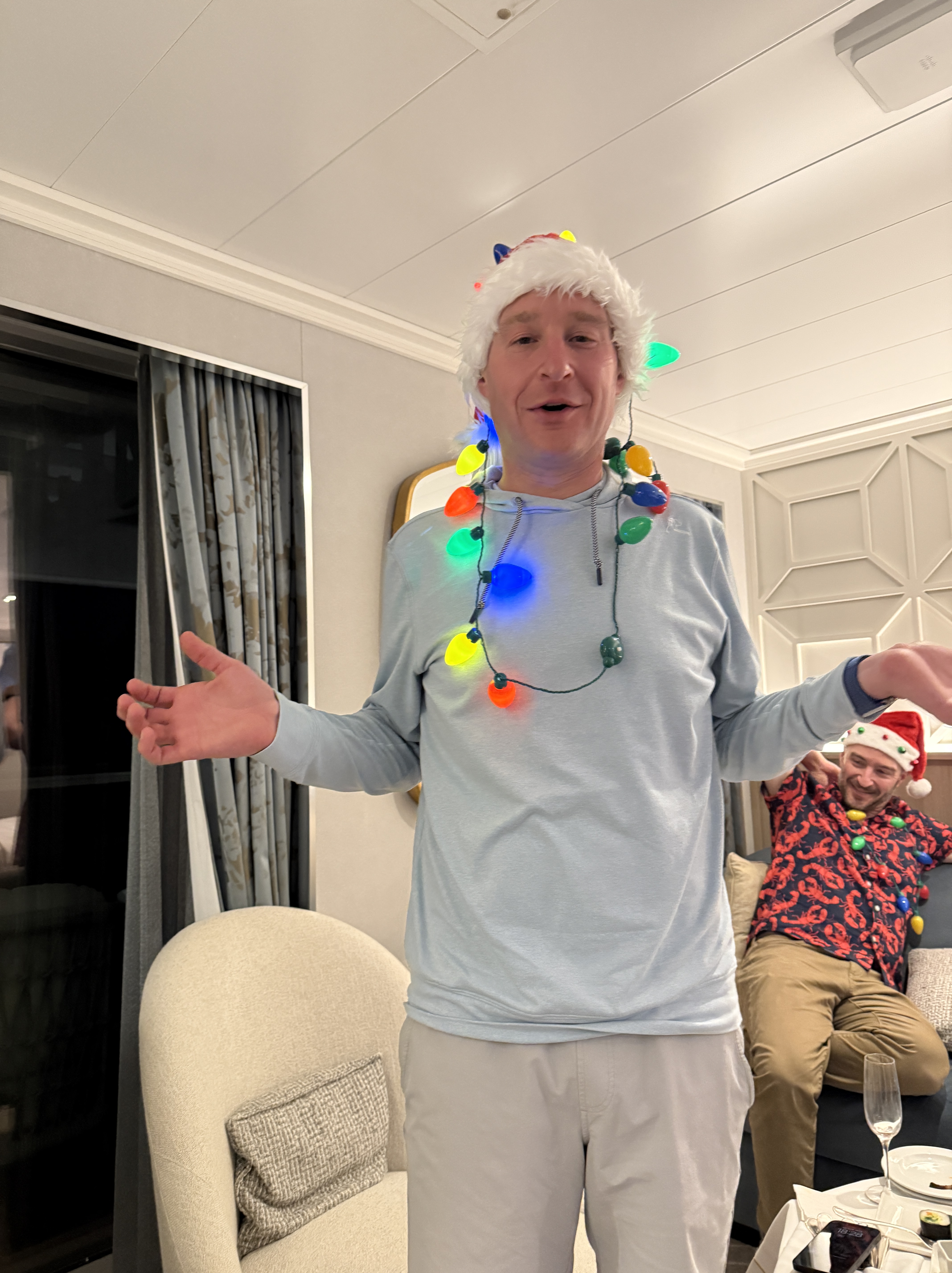 The Grinch even showed up! We did have a one year old on board and just a few other young people too. Simon announced that there were some small elves hidden around the ship and that a small Santa holding 50 Big O points was also hidden. Mark and Ramsay had an idea where that might be but were just a moment too late to find it before two kids got it!