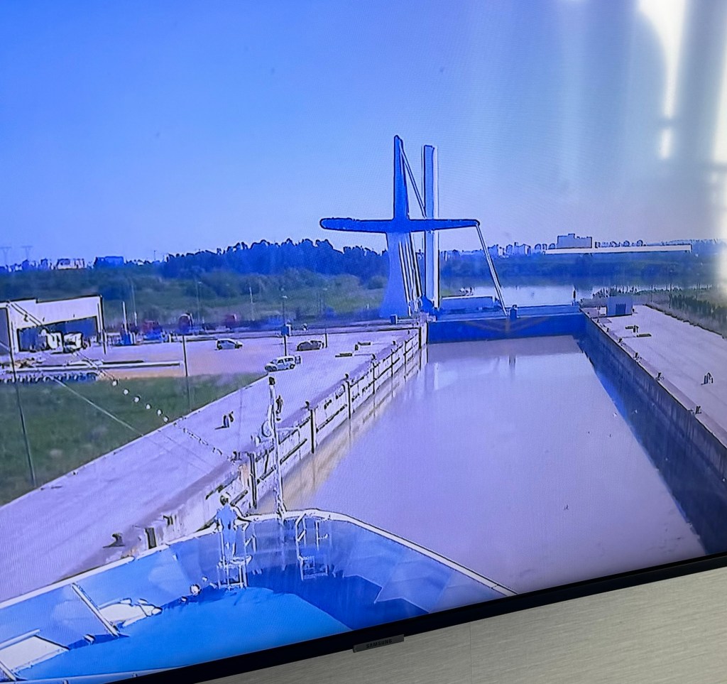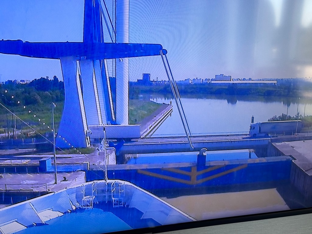 Here are some other shots of our approach. There are three bridges here, one red metal railway bridge that dates back to 1890 and two others built in the 1960s and 1990s. We went under all three. We learned later that the 1960s bridge is only used for buses and trucks which explains why we didn’t see any cars on it when we passed under the bridge. It is supposed to be renovated but things are moving slowly. In the meantime it is used to test our self driving trucks!